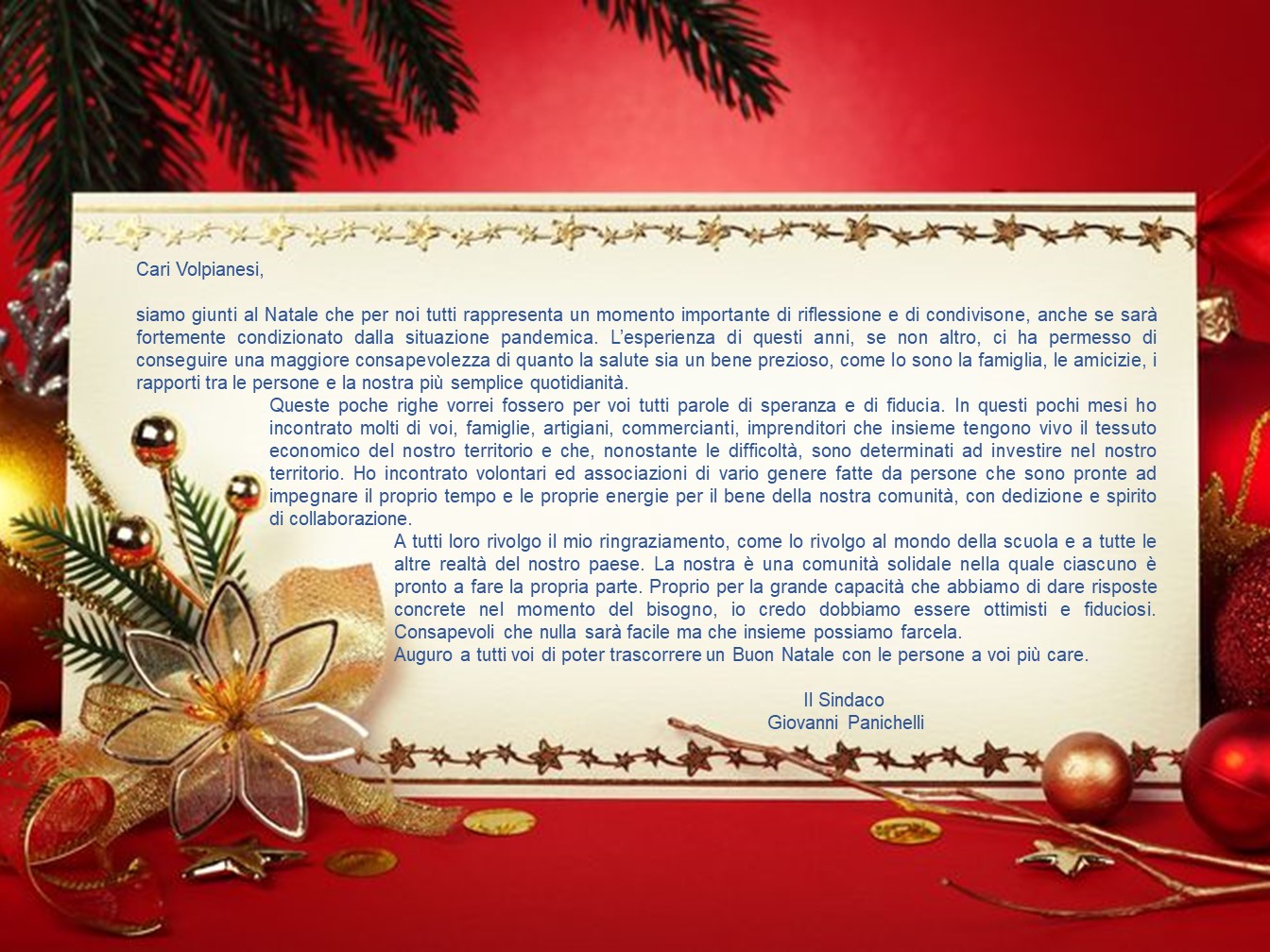 siamo giunti al Natale che per noi tutti rappresenta un momento importante di riflessione e di condivisione, anche se sarà fortemente condizionato dalla situazione pandemica. L’esperienza di questi anni, se non altro, ci ha permesso di conseguire una maggiore consapevolezza di quanto la salute sia un bene prezioso, come lo sono la famiglia, le amicizie, i rapporti tra le persone e la nostra più semplice quotidianità.
