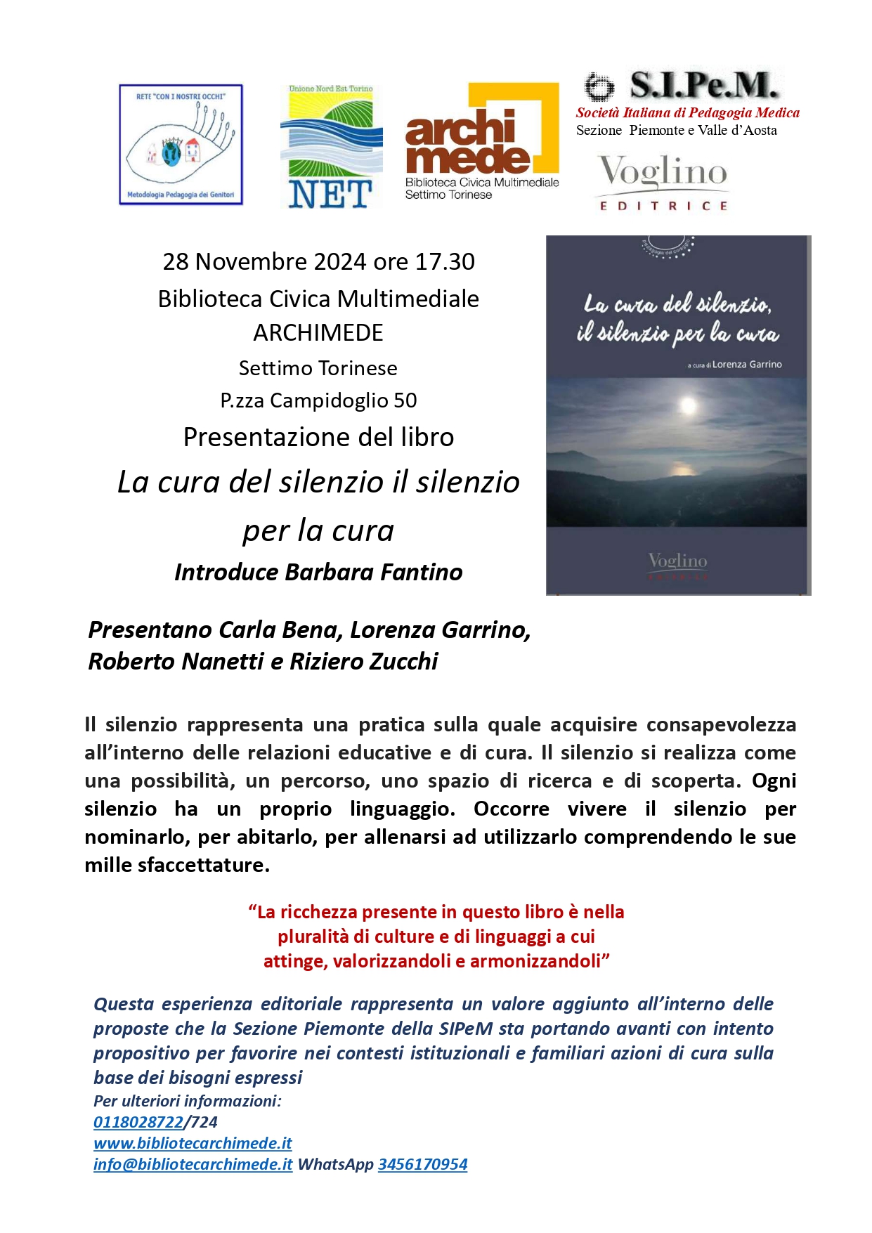 Il 28 Novembre 2024 alle ore 17.30 presso la Biblioteca Civica Multimediale ARCHIMEDE di Settimo Torinese, in P.zza Campidoglio 50, si svolgerà la presentazione del libro "La cura del silenzio, il silenzio per la cura" Introduce Barbara Fantino, presentano Carla Bena, Lorenza Garrino, Roberto Nanetti e Riziero Zucchi.
