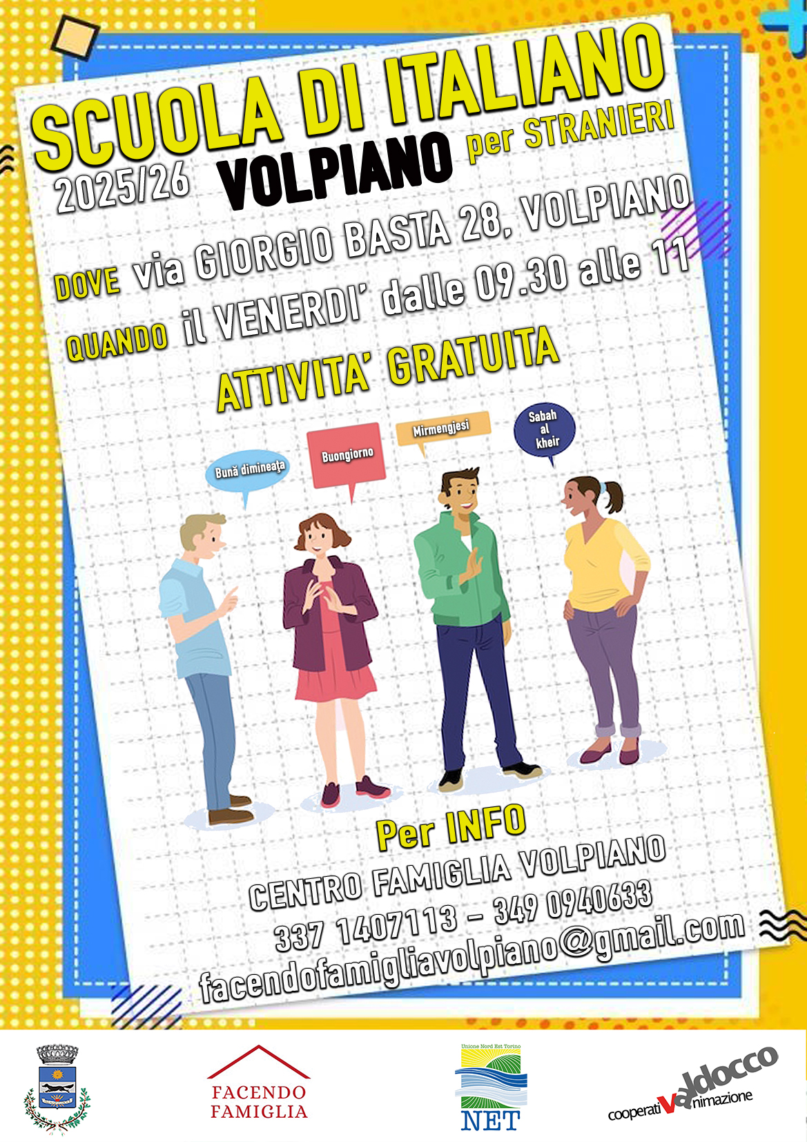 Parte a Volpiano la Scuola di Italiano per Stranieri, un’attività gratuita promossa dal Centro Famiglia di Volpiano, in collaborazione con volontari e con il supporto del Comune di Volpiano e dell’Unione NET.