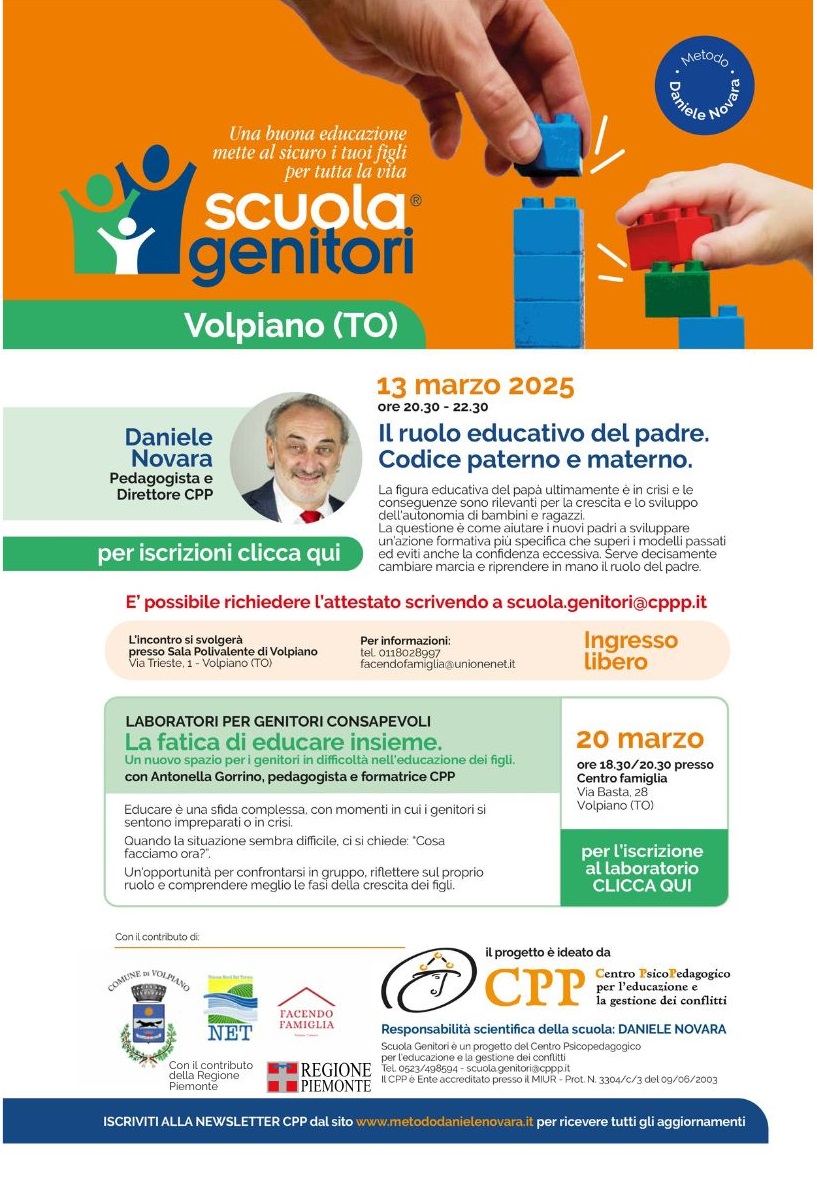 Prossimo appuntamento giovedì 13 marzo alle 20:30 a Volpiano con Daniele Novara sul Ruolo educativo del padre in via Trieste 1 in Sala Polivalente "Maria Foglia".