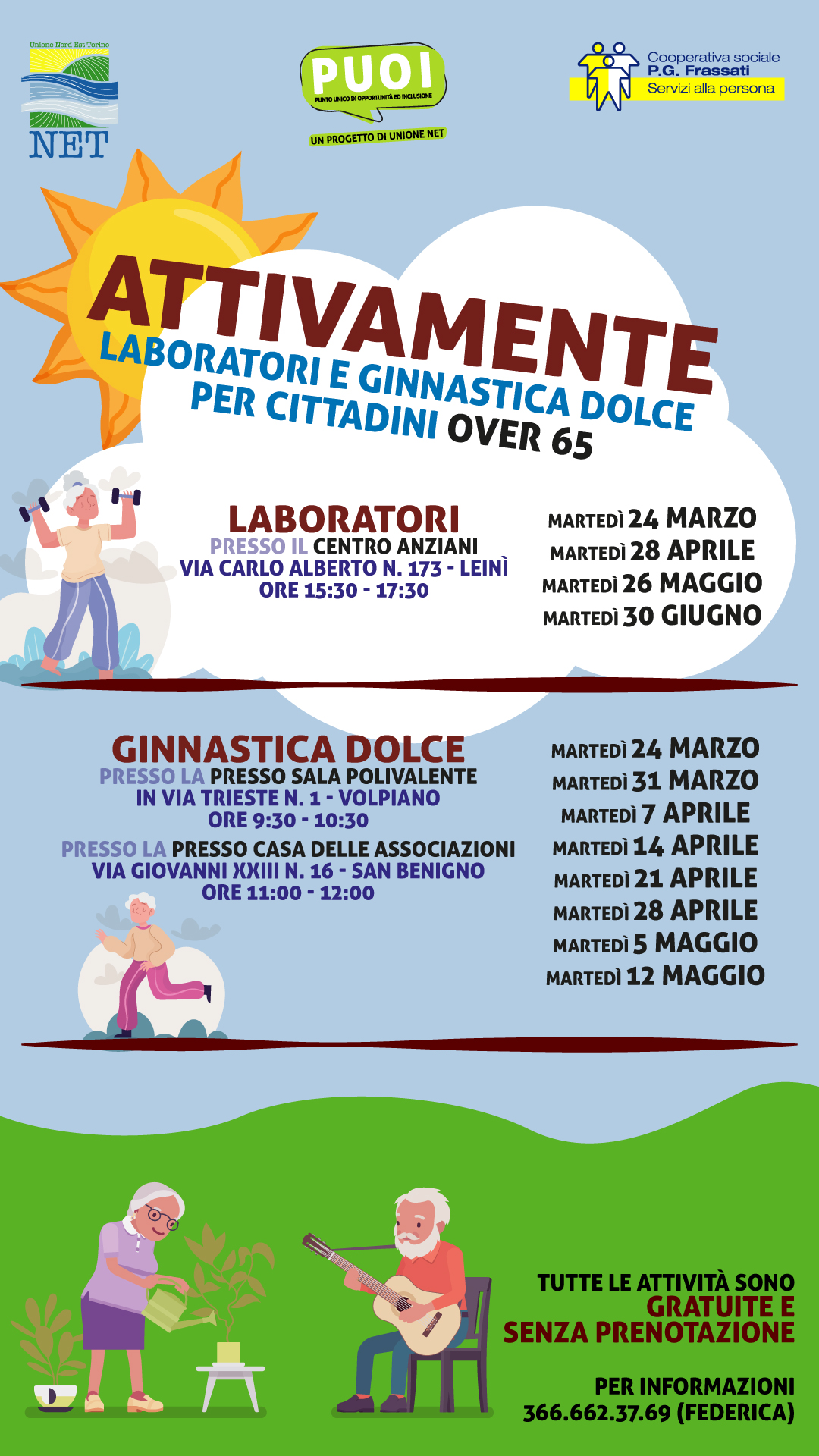 Il programma prevede incontri di ginnastica dolce e laboratori pensati per favorire il movimento, la partecipazione e il benessere psicofisico degli anziani. Le attività si svolgeranno a partire dal 24 marzo presso la Sala Polivalente di via Trieste 1 a Volpiano e la Casa delle Associazioni di San Benigno, oltre a laboratori organizzati al Centro Anziani di Leinì.