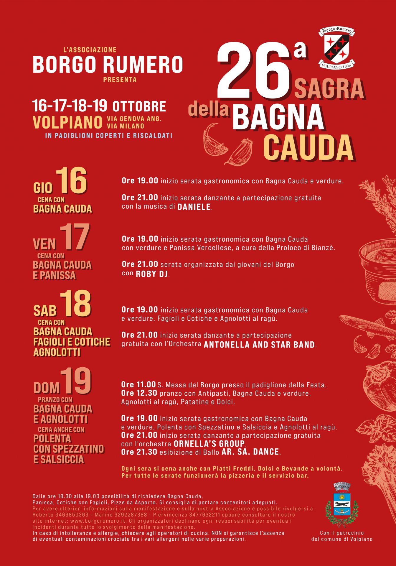 L’Associazione Borgo Rumero presenta la 26ª Sagra della Bagna Cauda, uno degli appuntamenti più attesi dell’autunno volpianese. Quattro giorni di gusto, tradizione e convivialità, con padiglioni coperti e riscaldati in via Genova ang. via Milano.