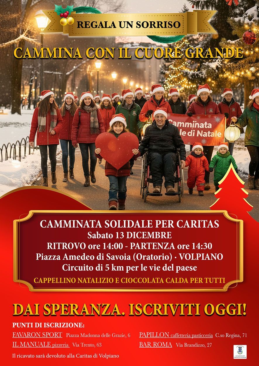 L'Associazione Runner Team99 SBV invita la cittadinanza a partecipare alla Camminata Solidale per Caritas, un appuntamento dedicato alla solidarietà e alla condivisione, pensato per sostenere le attività della Caritas locale durante il periodo natalizio.