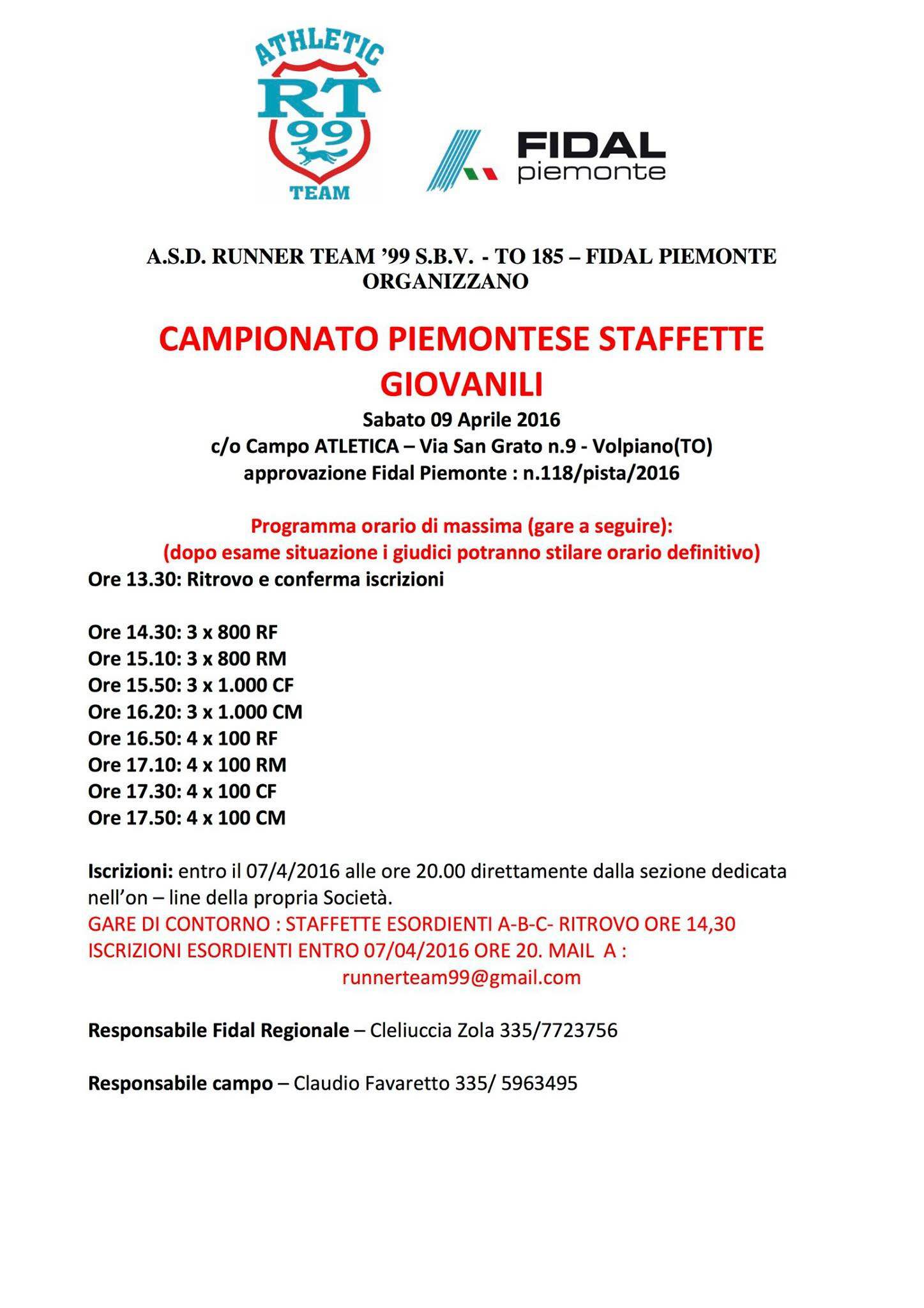 Iscrizioni gare di contorno (staffette Esordienti A-B-C) entro il 7/4/2016 alle ore 20.00 via mail a runnerteam99@gmail.com.