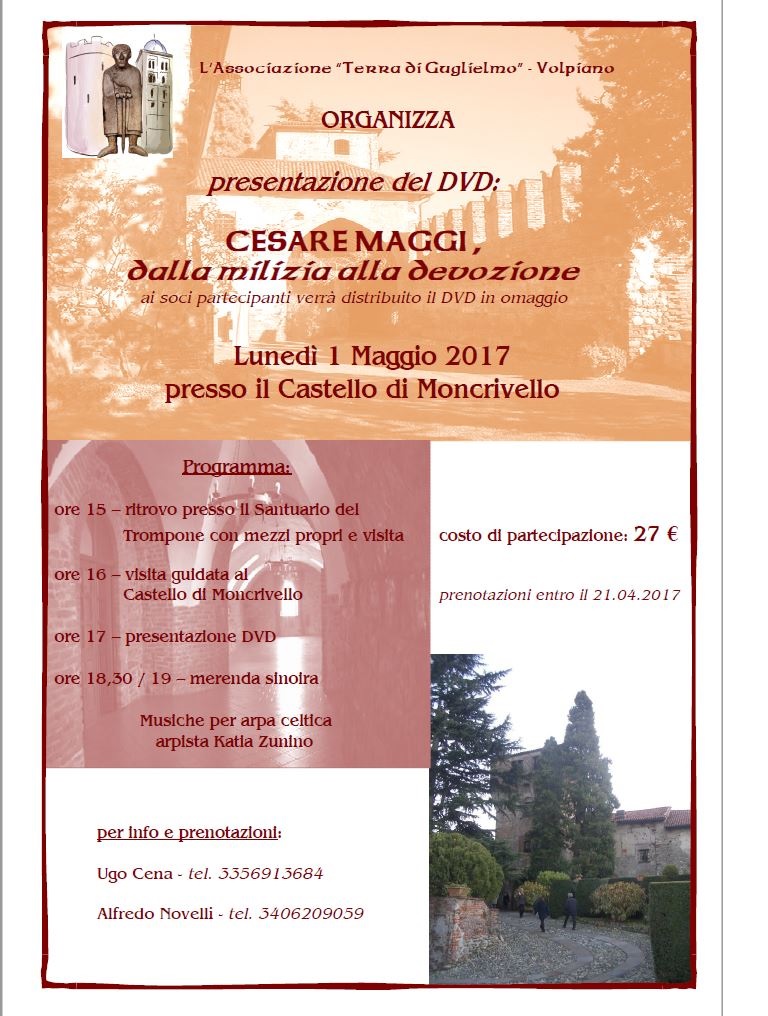 Lunedì 1 maggio dalle ore 15 alle ore 19, presentazione al Castello di Moncrivello del dvd su Cesare Maggi a seguire merenda sinoira nel maniero, accompagnata da musiche per arpa celtica( arpista Katia Zunino), con visita guidata al castello.