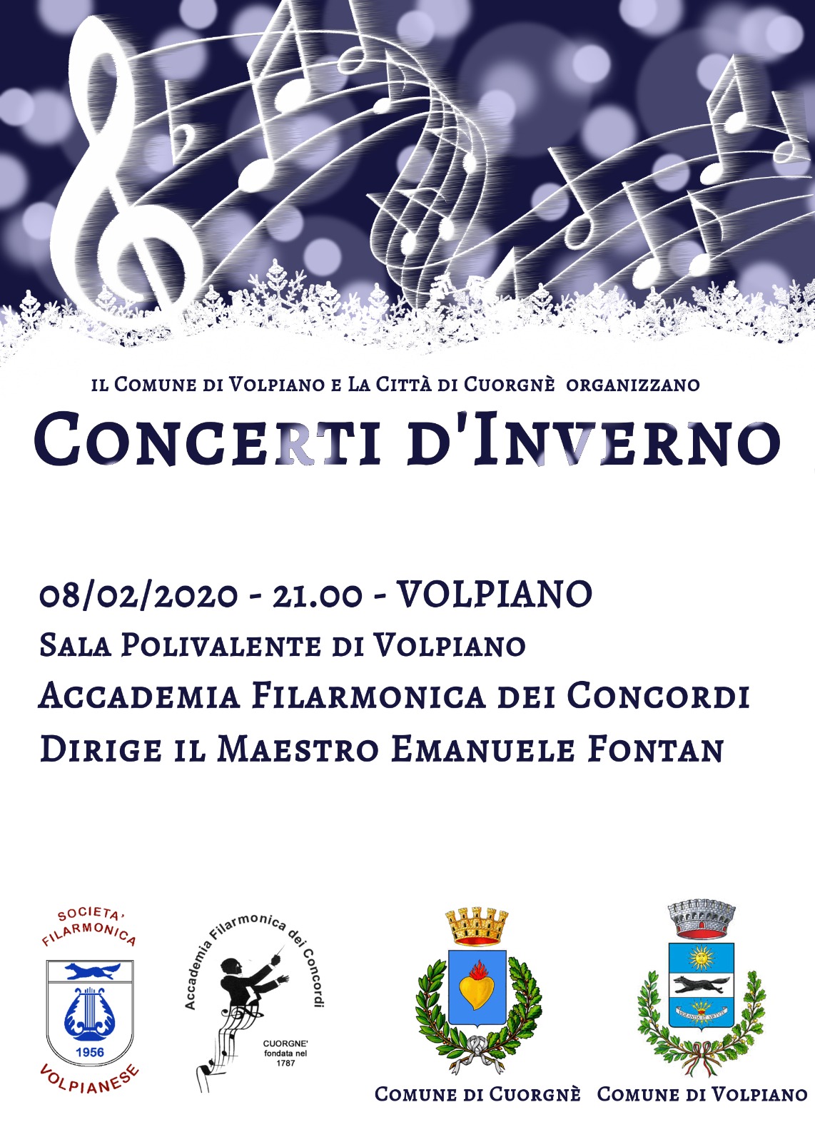 Presso la Sala polivalente del Comune di Volpiano in via Trieste, 1, sabato 8 febbraio 2020, per la rassegna Concerti d'Autunno, si esibizione dell'Accademia Filarmonica dei Concordi, dirige il Maestro Emanuele Fontan.