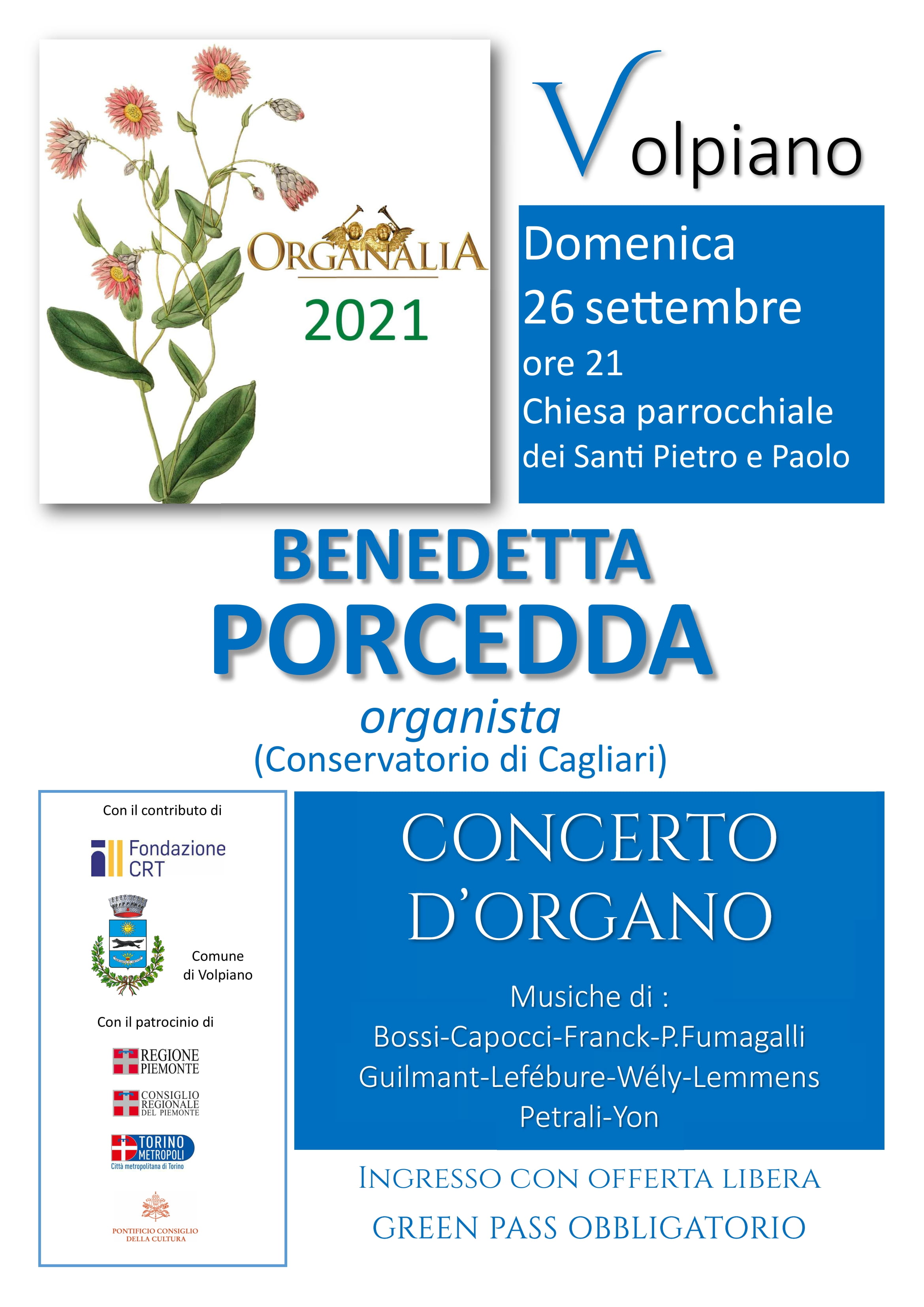 Domenica 26 settembre alle 21 nella chiesa parrocchiale dei Santi Pietro e Paolo si tiene il concerto d’organo di Benedetta Porcedda per la stagione Organalia 2021; in programma musiche di Bossi, Capocci, Franck, Fumagalli, Guilmant, Lefébure-Wély, Lemmens, Petrali, Yon.