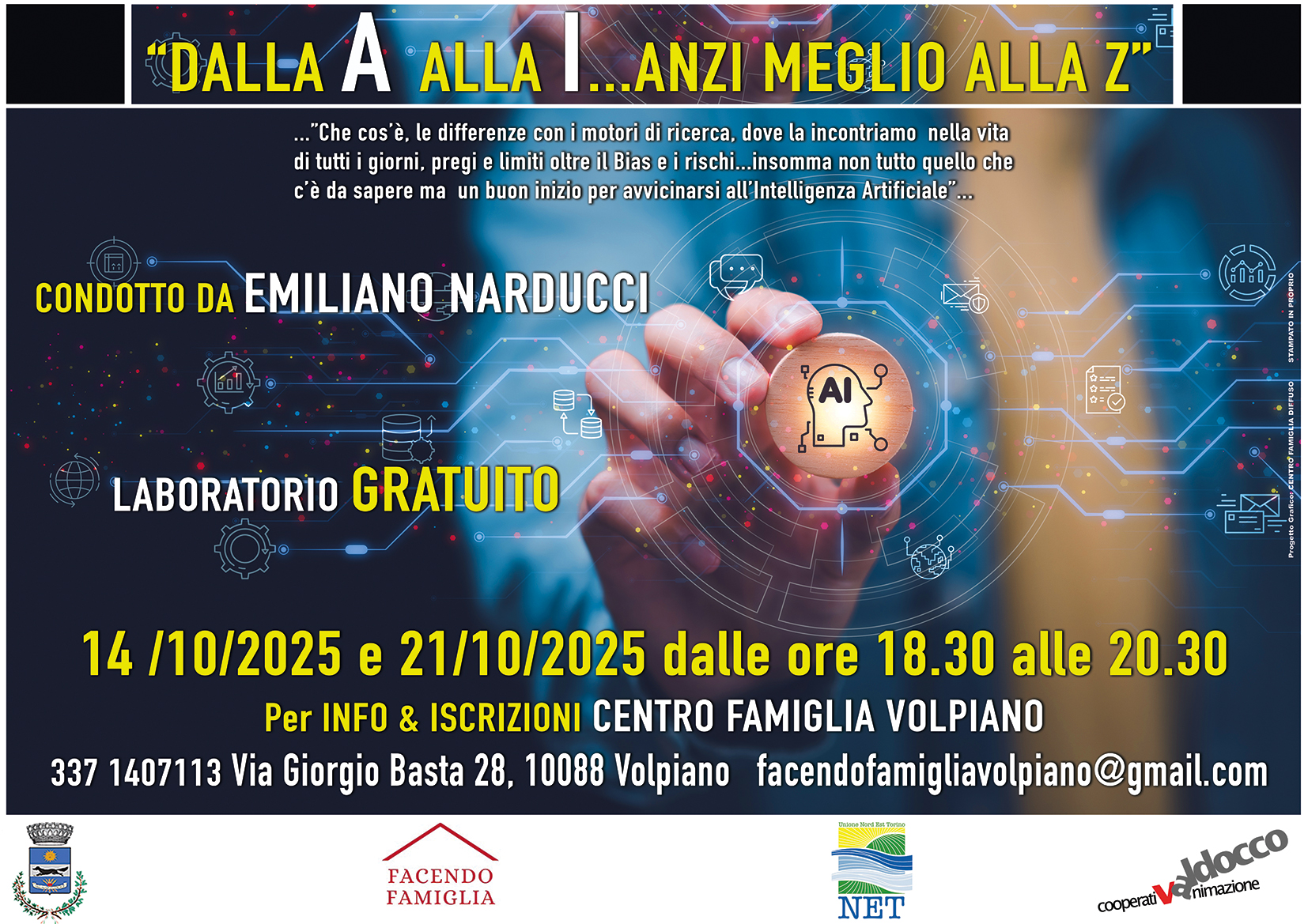 Il laboratorio, condotto da Emiliano Narducci, guiderà i partecipanti a conoscere cos’è l’IA, come si differenzia dai motori di ricerca, dove la incontriamo tutti i giorni, quali sono i suoi pregi e limiti, senza dimenticare bias e rischi legati al suo utilizzo. Un percorso divulgativo, adatto a tutti, per muovere i primi passi e avvicinarsi in modo consapevole a questa nuova tecnologia.