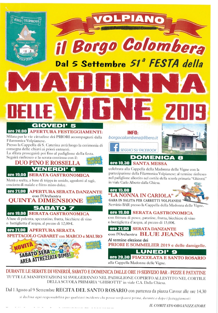 Il Borgo Colombera, organizza la 51^ edizione della Festa della Madonna delle Vigne nei giorni 5-6-7- 8 e 9 Settembre 2019 presso il padiglione allestito nel cortile della Scuola Elementare "Ghirotti" in viale Alberto Dalla Chiesa.