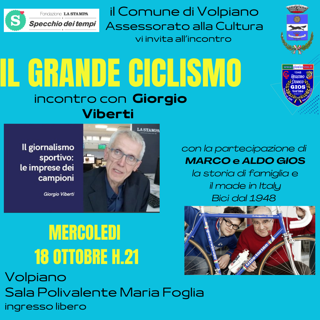 Mercoledì 18 ottobre alle 21, a Volpiano nella Sala polivalente «Maria Foglia» (via Trieste 1), il Comune organizza un incontro con il giornalista sportivo Giorgio Viberti, sulle imprese dei grandi campioni; modera Emanuele De Zuanne, partecipano Marco e Aldo Gios, storica famiglia di costruttori di biciclette da corsa di Volpiano, ingresso libero.