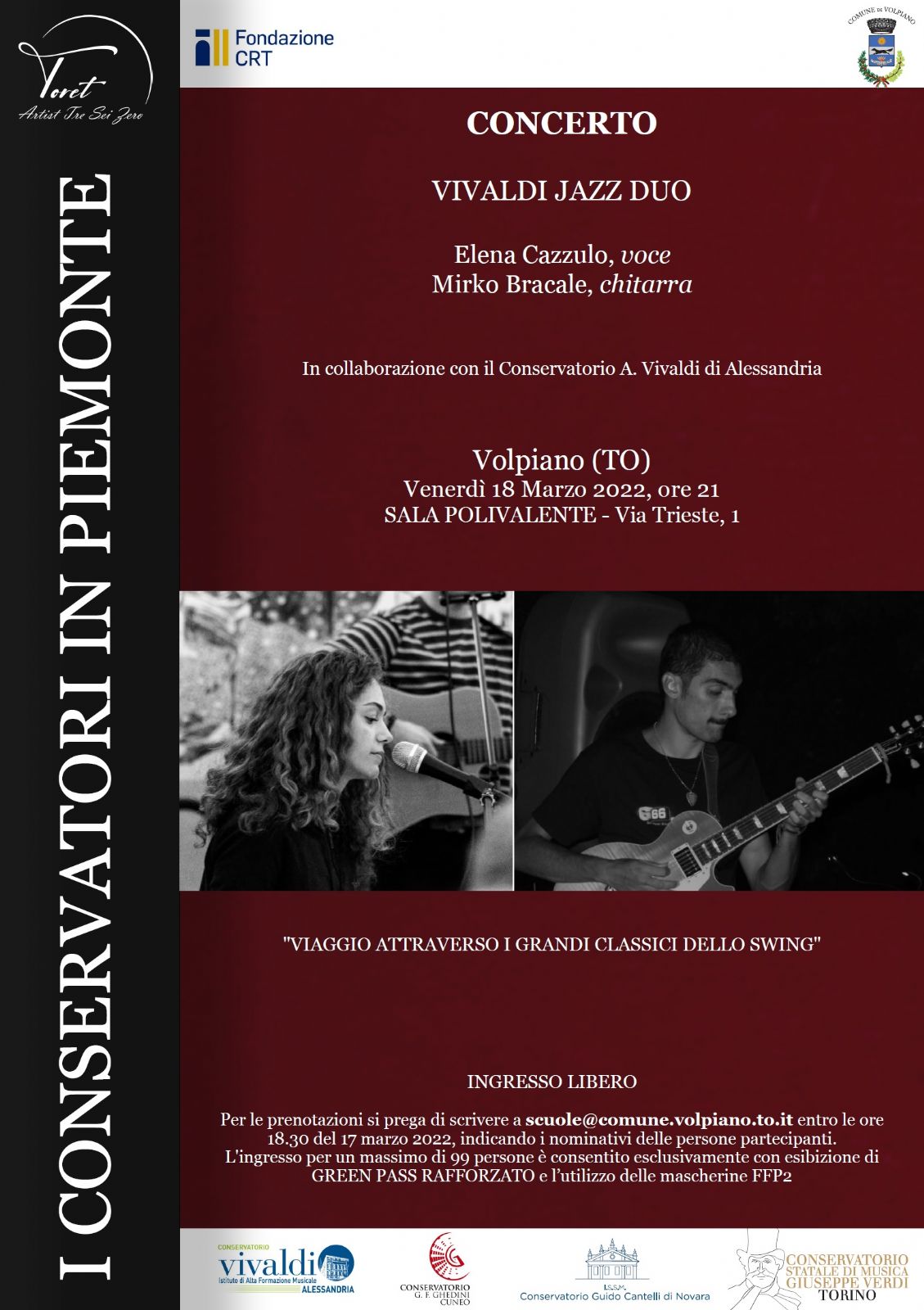 Venerdì 18 Marzo, ore 21 presso la Sala Polivalente di via Trieste 1, il Comune di Volpiano e "l’Associazione TORET ARTIST Tre Sei Zero" in collaborazione con il Conservatorio A.Vivaldi di Alessandria presentano il concerto del Vivaldi Jazz Duo con Elena Cazzulo, voce e Mirko Bracale, chitarra.
