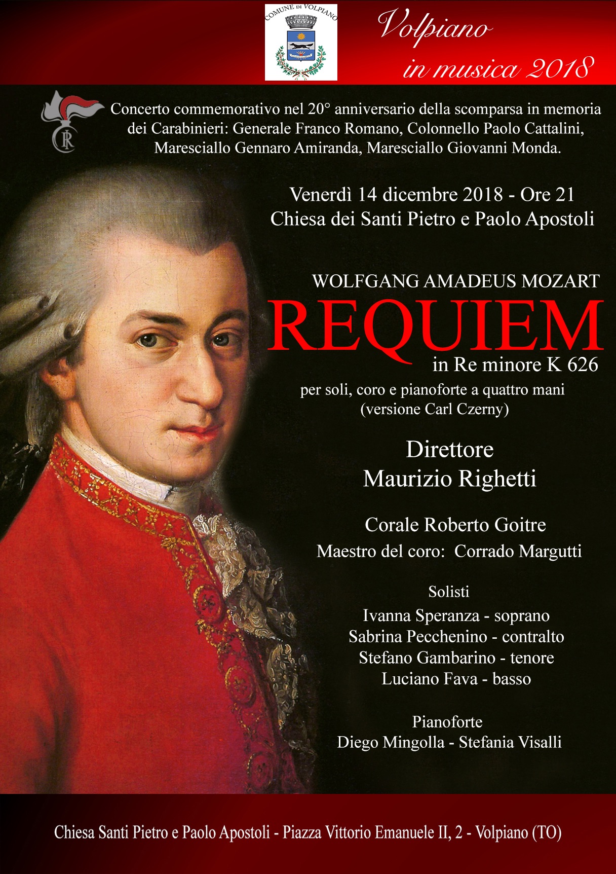 viene eseguito il Requiem in Re minore K 626 di Wolfgang Amadeus Mozart, per soli, coro e pianoforte a quattro mani, con la Corale «Roberto Goitre» diretta da Corrado Margutti, i solisti Ivanna Speranza (soprano), Sabrina Pecchenino (contralto), Stefano Gambarino (tenore) e Luciano Fava (basso), al pianoforte Diego Mingolla e Stefania Vassalli, dirige Maurizio Righetti. Ingresso libero.