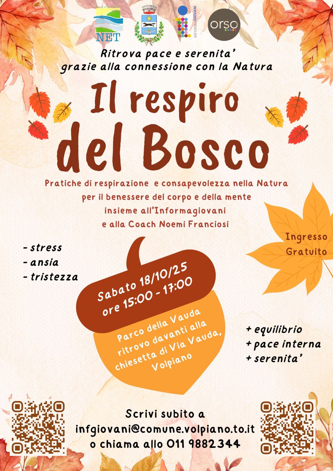L’Informagiovani del Comune di Volpiano invita a partecipare a “Il respiro del Bosco”, un’esperienza di meditazione, respirazione e consapevolezza immersa nella natura, in programma sabato 18 ottobre 2025 dalle ore 15:00 alle 17:00 al Parco della Vauda, con ritrovo davanti alla chiesetta di via Vauda.