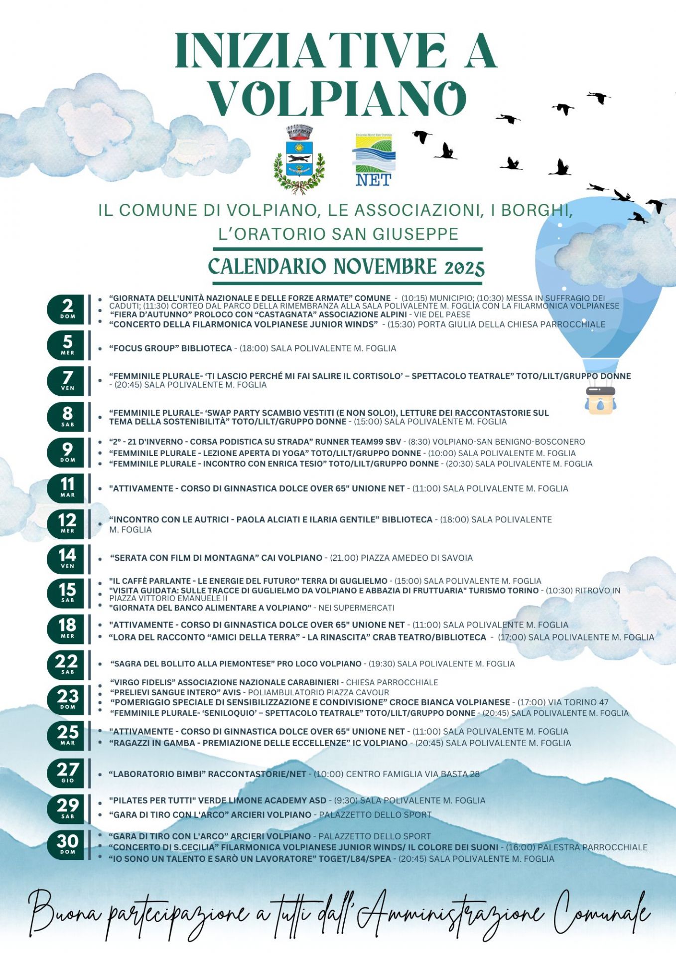 Presentiamo il fitto programma degli eventi di novembre 2025 a Volpiano, un calendario pieno di appuntamenti proposti dal Comune in collaborazione con associazioni, borghi e Oratorio San Giuseppe.