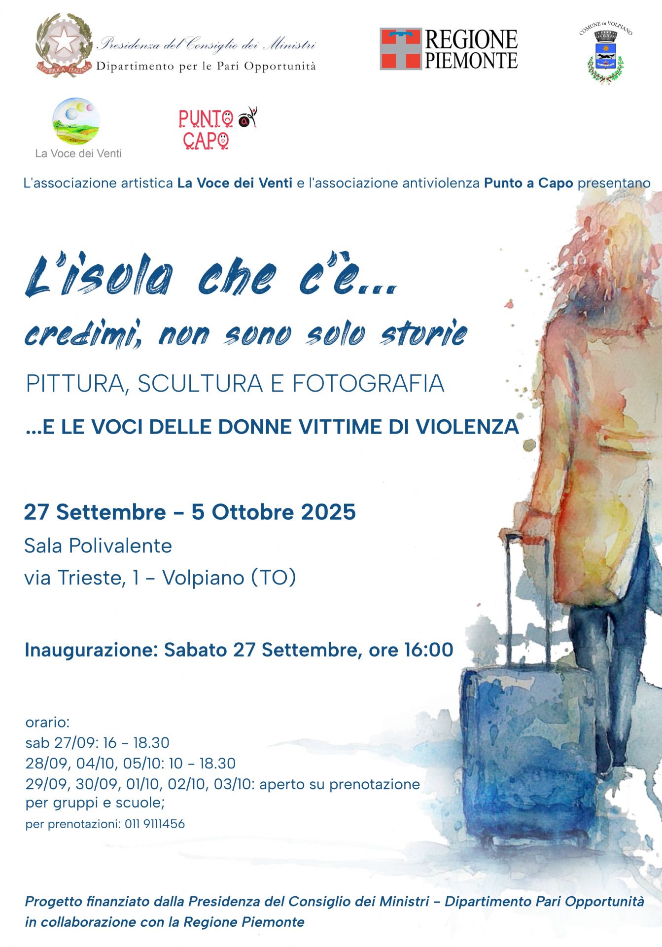 Dal 27 settembre al 5 ottobre 2025 la Sala Polivalente di Volpiano ospiterà la mostra “L’isola che c’è… credimi, non sono solo storie”, un percorso tra pittura, scultura e fotografia che intreccia arte e testimonianza, dando voce alle donne vittime di violenza. L’iniziativa, promossa dall’associazione artistica La Voce dei Venti e dall’associazione antiviolenza Punto a Capo, vuole essere un’occasione di riflessione e di incontro, capace di unire la forza espressiva delle opere alla necessità di ascoltare storie vere, che non devono restare in silenzio.