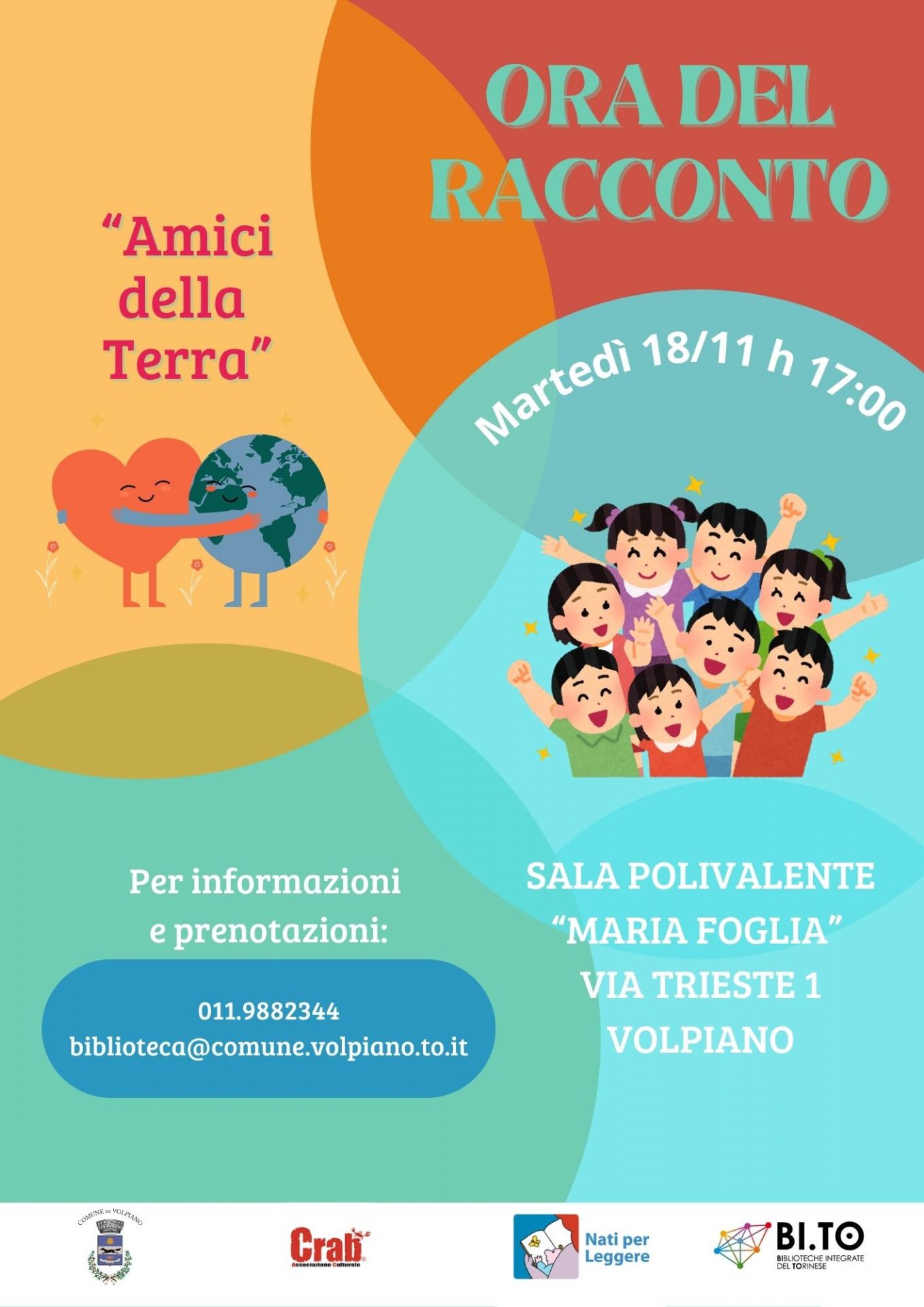 Il prossimo appuntamento dedicato ai più piccoli, dal titolo "Amici della terra", si terrà il 18 novembre alle ore 17.00 in Sala Polivalente "Maria Foglia", via Trieste 1, a Volpiano.