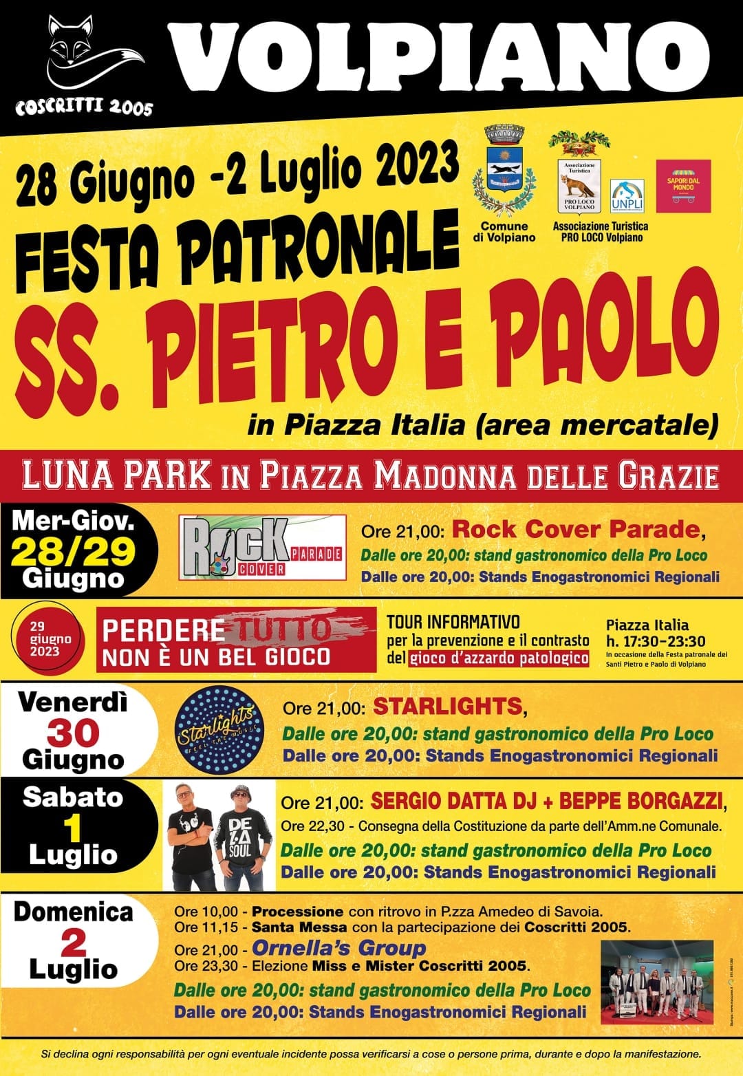 Si comincia mercoledì e giovedì con la Rock Cover Parade, il concorso per band giunto alla nona edizione; giovedì 29 giugno dalle 17.30 in piazza Italia è anche presente anche il tour informativo «Perdere tutto non è un bel gioco», per la prevenzione e il contrasto del gioco d’azzardo. Venerdì sera salgono sul palco gli Starlights con musica dagli anni Settanta ad oggi, mentre sabato viene consegnata la Costituzione italiana ai neo-diciottenni e si balla con Sergio Datta dj e Beppe Borgazzi. Domenica 2 luglio, al mattino si svolge la processione seguita dalla messa delle 11.15 nella chiesa parrocchiale, in serata avviene l’elezione di Miss e Mister Coscritti 2005 e la festa si chiude con la musica dell’orchestra Ornella’s Group.