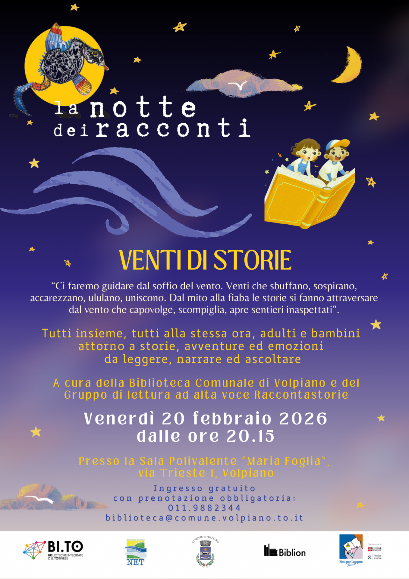 La Biblioteca Comunale di Volpiano, in collaborazione con il Gruppo di lettura ad alta voce Raccontastorie, invita cittadini, famiglie e appassionati di narrazione a partecipare a “La Notte dei Racconti – Venti di storie”, una serata speciale dedicata al piacere dell’ascolto e della condivisione delle storie.