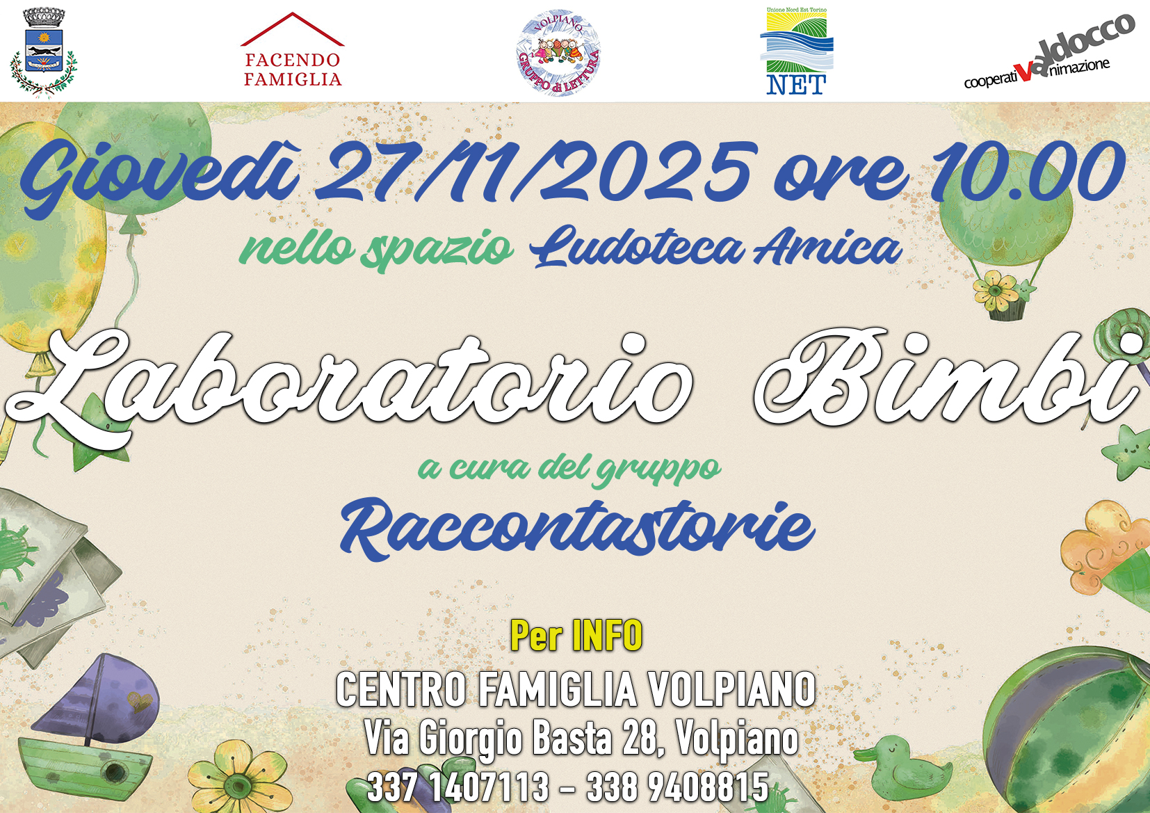 Giovedì 27 novembre 2025, alle ore 10.00, torna uno degli appuntamenti più amati dai più piccoli: il Laboratorio Bimbi nello spazio Ludoteca Amica del Centro Famiglia Volpiano!