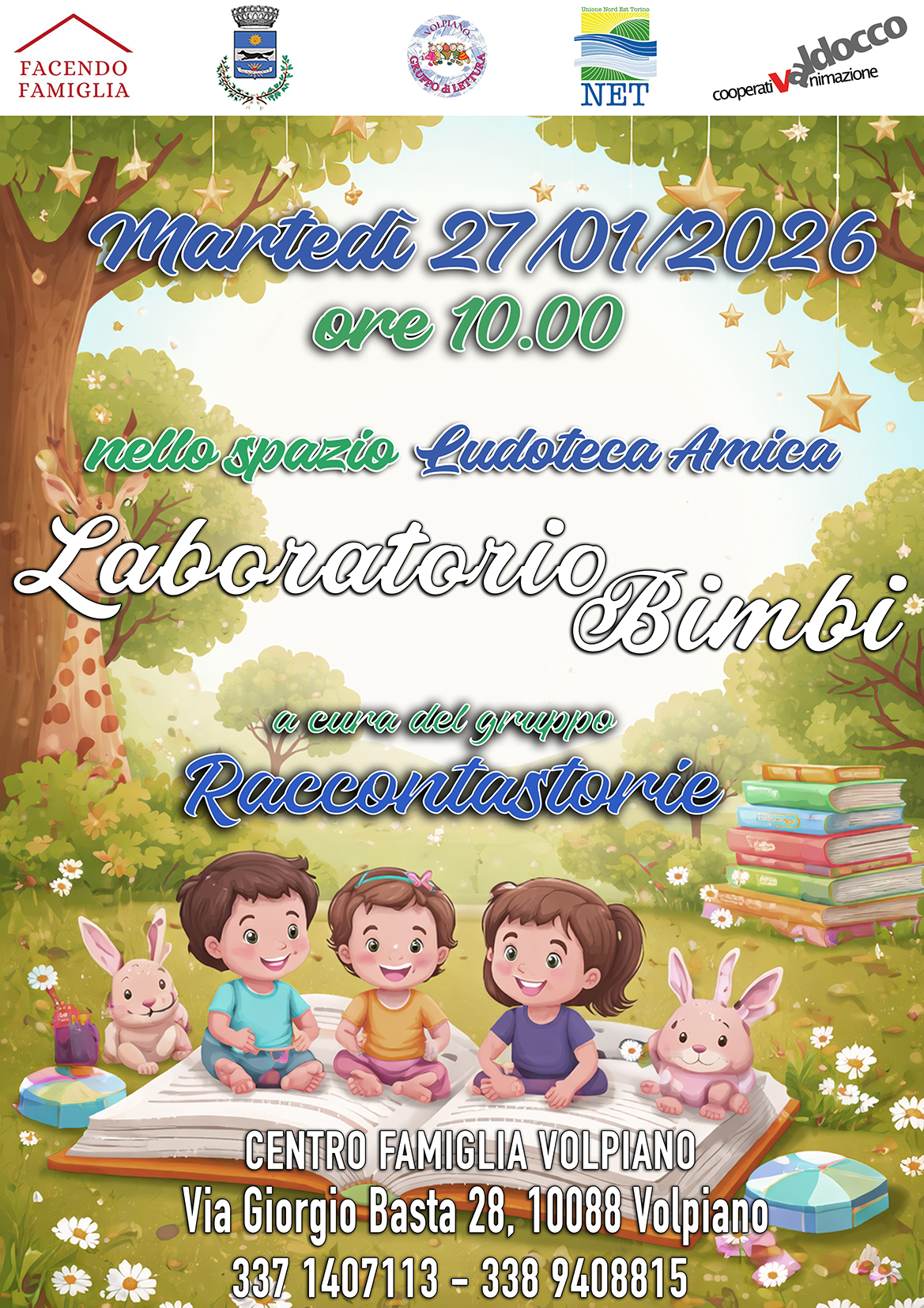 Il Centro Famiglia di Volpiano, in collaborazione con il gruppo Raccontastorie, propone un nuovo laboratorio dedicato ai bambini, pensato per stimolare fantasia, ascolto e creatività attraverso la lettura ad alta voce e attività ludico-educative.