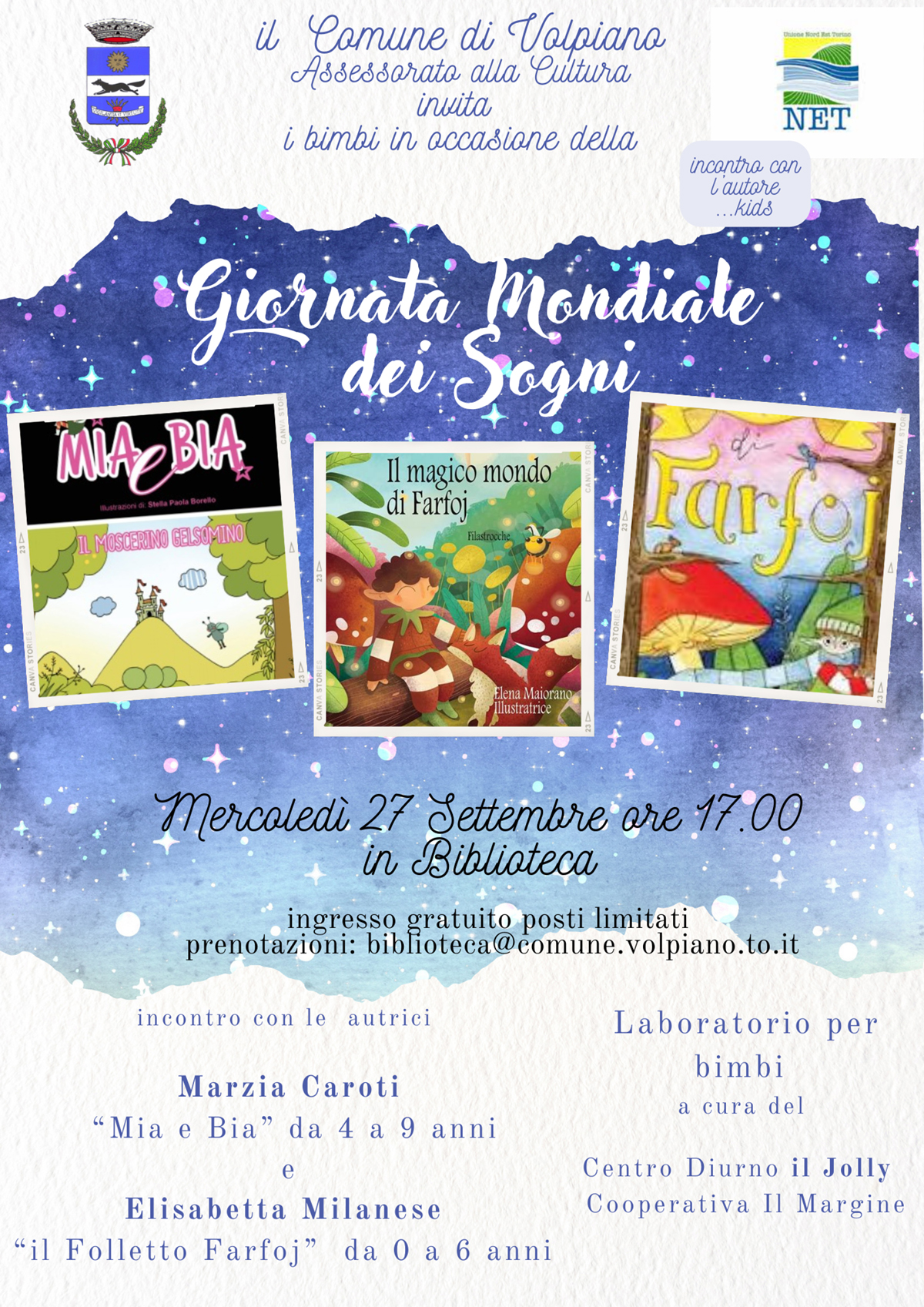 Il Comune di Volpiano, in occasione della Giornata mondiale dei Sogni, organizza mercoledì 27 settembre alle 17 in biblioteca (via Carlo Botta 26), l’incontro con le autrici di libri per bambini da zero a nove anni Marzia Caroti ed Elisabetta Milanese, e il laboratorio per bambini a cura del centro diurno Il Jolly; posti limitati, prenotazioni all’indirizzo di posta elettronica biblioteca@comune.volpiano.to.it.