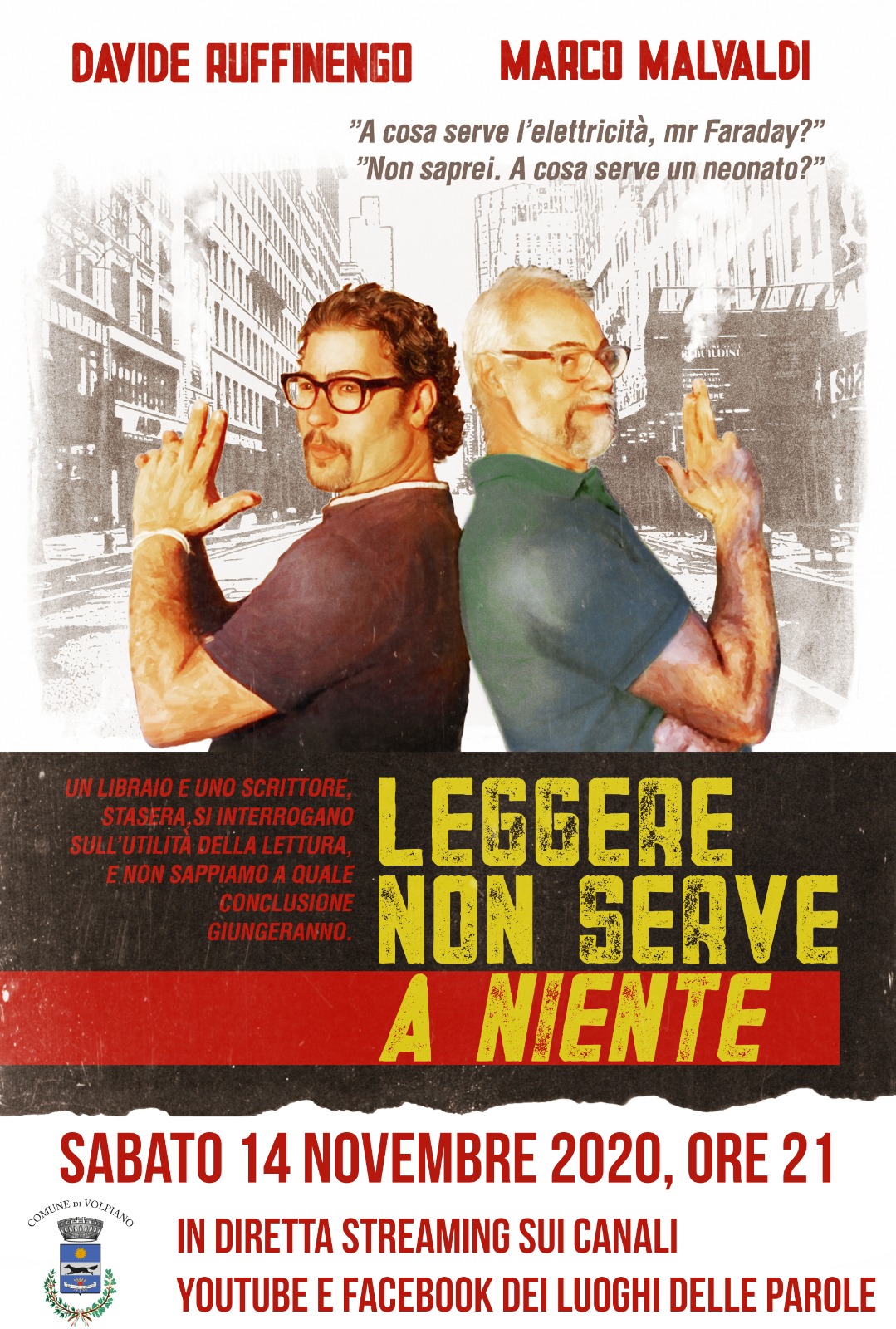 Sabato 14 novembre alle 21, in diretta online sulla pagina Facebook «I Luoghi delle Parole», Marco Malvaldi e Davide Ruffinengo s’interrogano sull’utilità della parola con lo spettacolo «Leggere non serve a niente»; la serata, inizialmente prevista nella Chiesa della Confraternita di Volpiano, si svolge online in seguito ai provvedimenti anti-Covid in vigore.