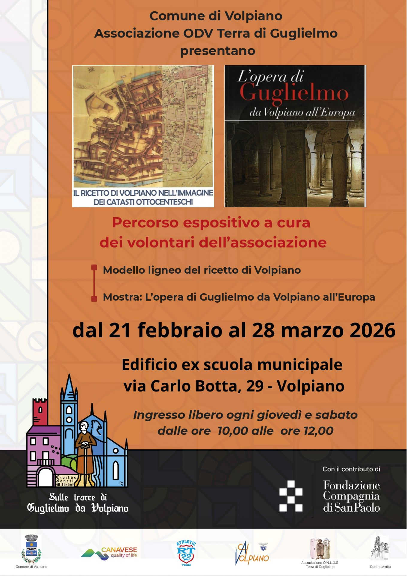La mostra, curata dai volontari dell’associazione, presenta il modello ligneo del Ricetto di Volpiano e il percorso espositivo “L’opera di Guglielmo da Volpiano all’Europa”, che ripercorre l’influenza del monaco benedettino e il suo contributo allo sviluppo del monachesimo e dell’architettura religiosa medievale.