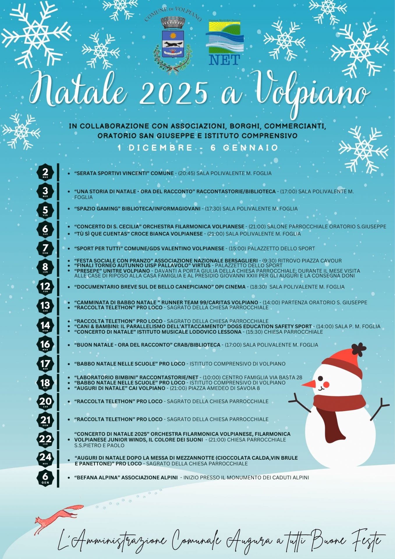 L’Amministrazione Comunale di Volpiano, in collaborazione con associazioni, borghi, commercianti, Oratorio San Giuseppe e Istituto Comprensivo, è lieta di presentare il ricco calendario di iniziative natalizie che accompagnerà il paese dal 1° dicembre 2025 al 6 gennaio 2026.