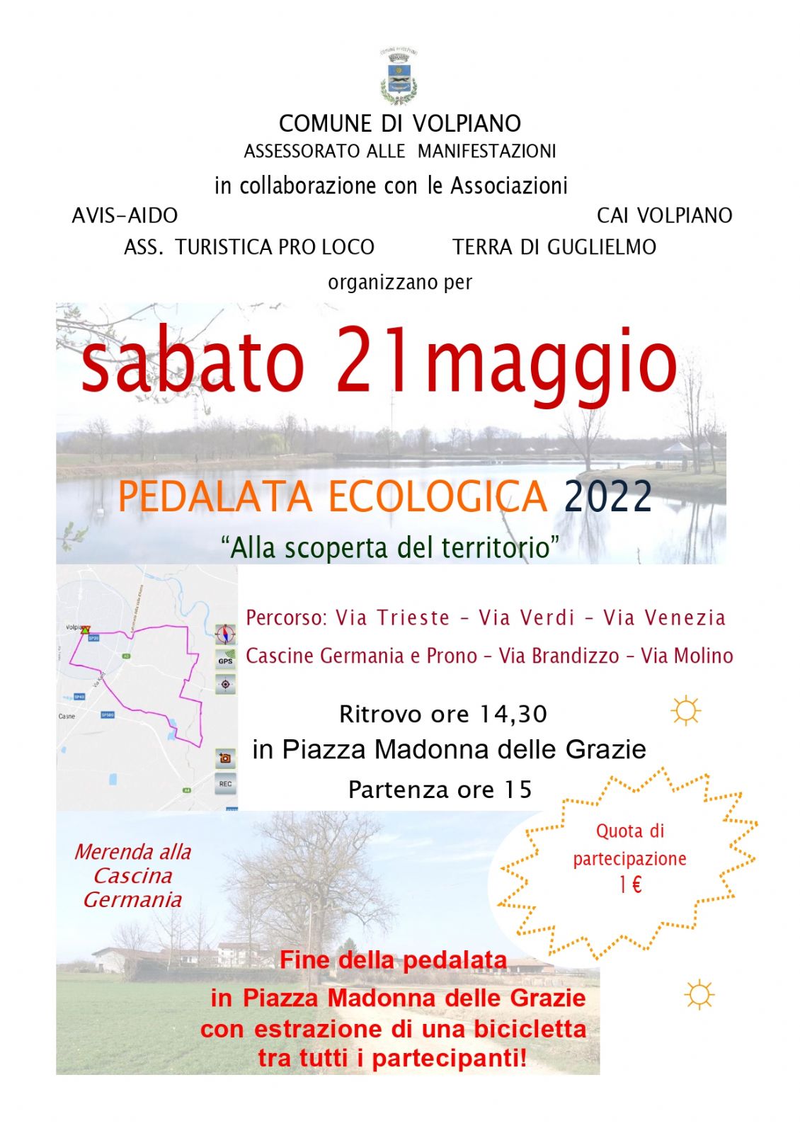 Il Comune di Volpiano, in collaborazione con le Associazioni Terra di Guglielmo, CAI Volpiano, Avis - Aido e Pro Loco, organizza nella giornata di Sabato 21 maggio la tradizionale pedalata ecologica "Alla scoperta del territorio"