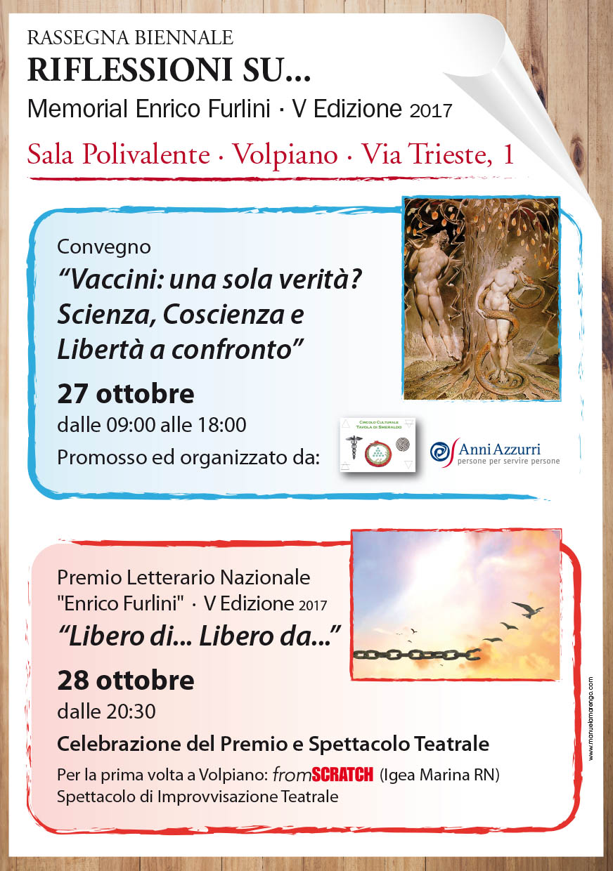 Venerdì 27 ottobre 2017 si svolgerà presso la sala Polivalente di via Trieste,1 dalle ore 8,30 alle ore 18,30 Il convegno "Riflessioni su...Vaccini:una sola verità? scienza,coscienza e libertà a confronto", la tematica, di grande attualità dopo le recenti normative, sarà sviluppata da numerosi interventi.