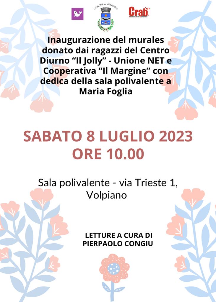 Sabato 8 luglio alle 10, alla Sala polivalente di via Trieste viene inaugurato il murales donato dai ragazzi del Centro diurno «Il Jolly», Unione Net e Cooperativa «Il Margine», con dedica della Sala Polivalente a Maria Foglia, allieva della scuola di teatro «Orme in viaggio», che ci ha lasciati a soli 16 anni il 2 luglio 2008.