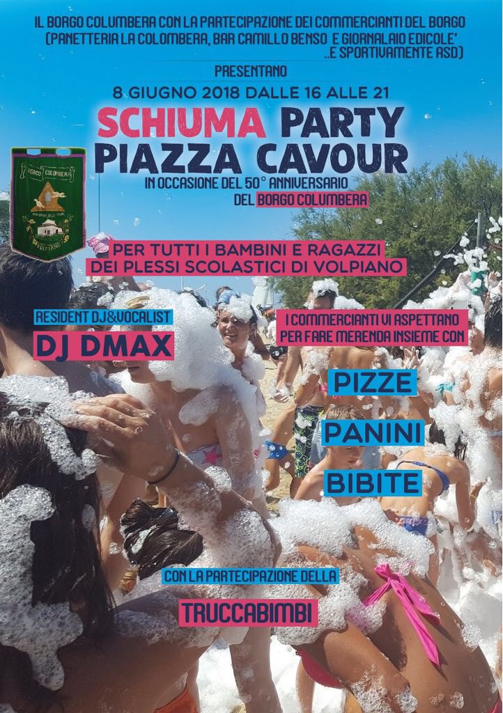Schiuma party in piazza Cavour a Volpiano dalle ore 16 del giorno 8 giugno 2018 per festeggiare il termine dell'anno scolastico, a cura del Borgo Columbera con la partecipazione dei commercianti del borgo... e del truccabimbi