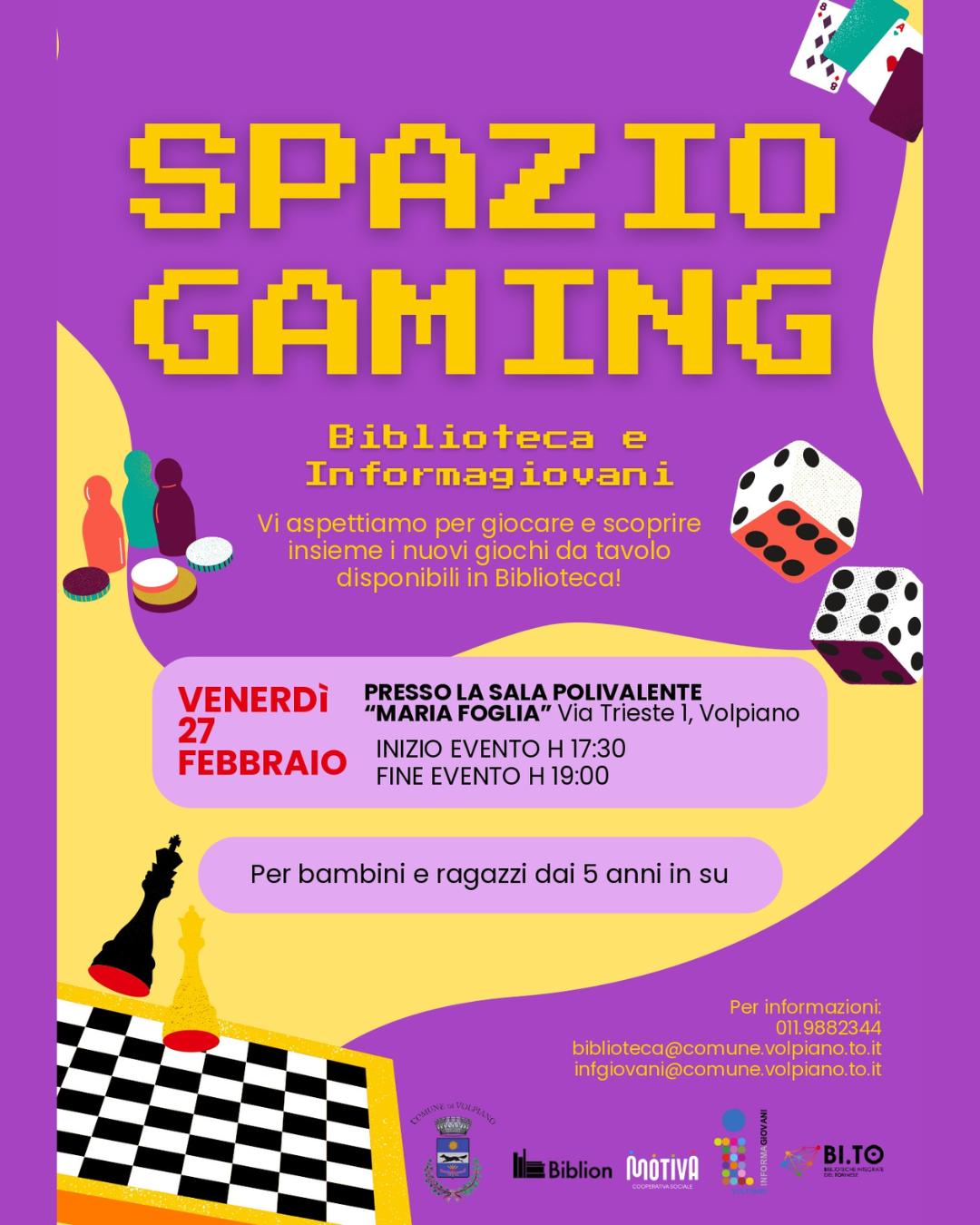 La Biblioteca Comunale e l’Informagiovani di Volpiano organizzano “Spazio Gaming”, il secondo appuntamento dedicato al gioco, alla socialità e alla scoperta dei nuovi giochi da tavolo disponibili in Biblioteca.
