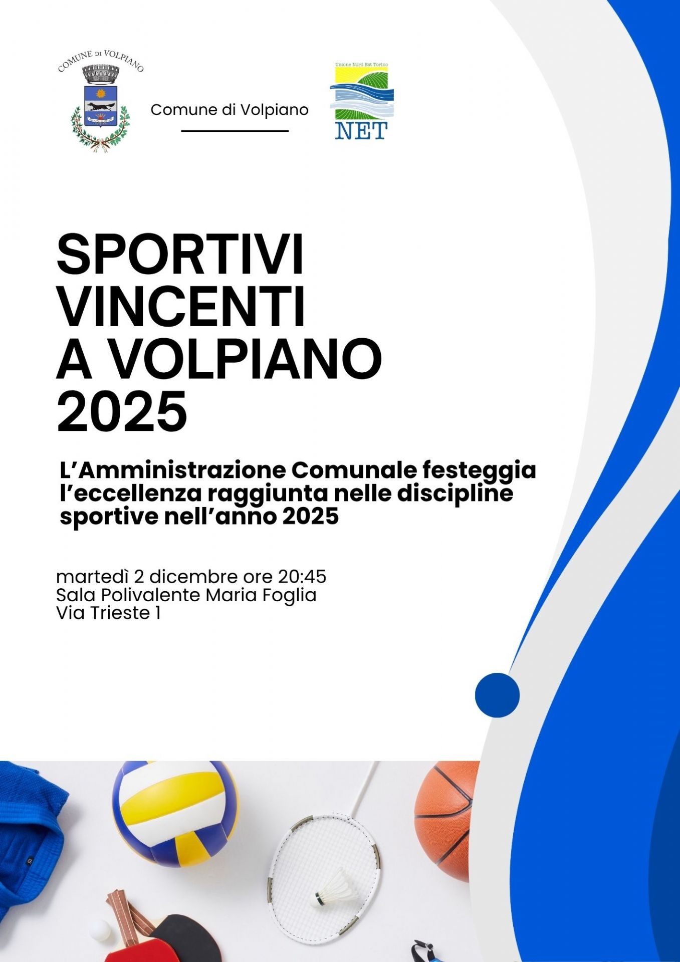 Il Comune di Volpiano organizza, come ogni anno, la serata “Sportivi Vincenti a Volpiano”, un momento dedicato alla valorizzazione delle eccellenze sportive locali.