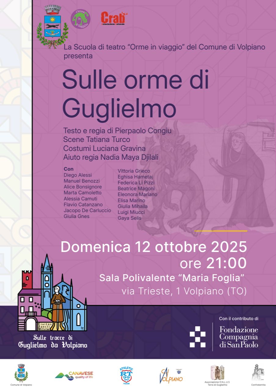 La Scuola di teatro Orme in viaggio del Comune di Volpiano è lieta di presentare lo spettacolo teatrale “Sulle orme di Guglielmo”, scritto e diretto da Pierpaolo Congiu.