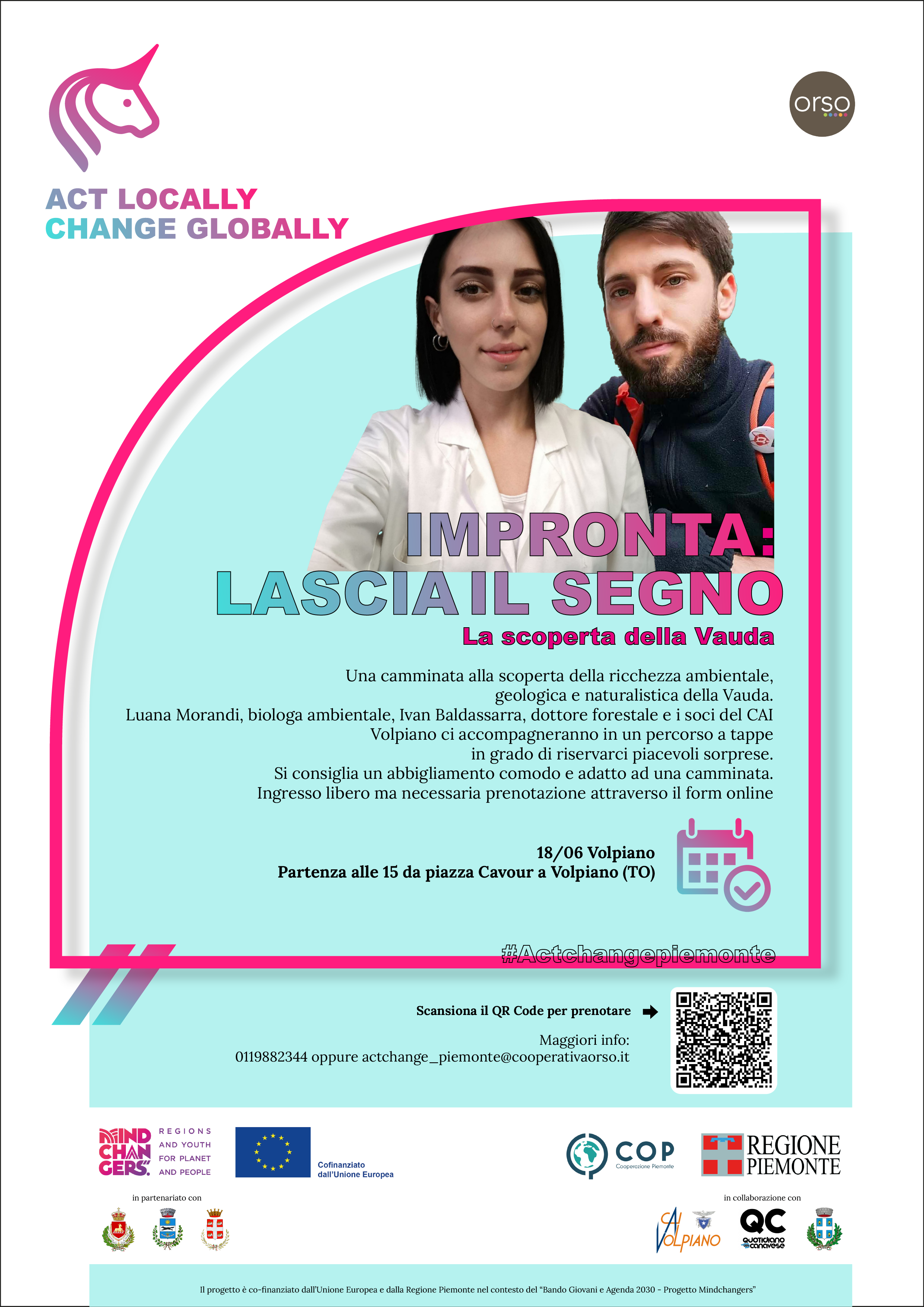 L’appuntamento è inserito nell’ambito del progetto «Act Change: act locally, change globally», volto al coinvolgimento diretto dei giovani su sostenibilità, rispetto dell’ambiente e contrasto al cambiamento climatico; info a questo indirizzo, posta elettronica actchange_piemonte@cooperativaorso.it.