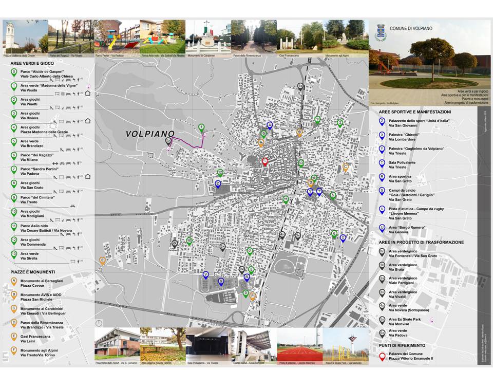 | Informazioni | "Aree verdi e per il gioco – Aree sportive e per le manifestazioni – Piazze monumenti – Aree in progetto di trasformazione” la mappa illustra le strutture della zona urbana di Volpiano |