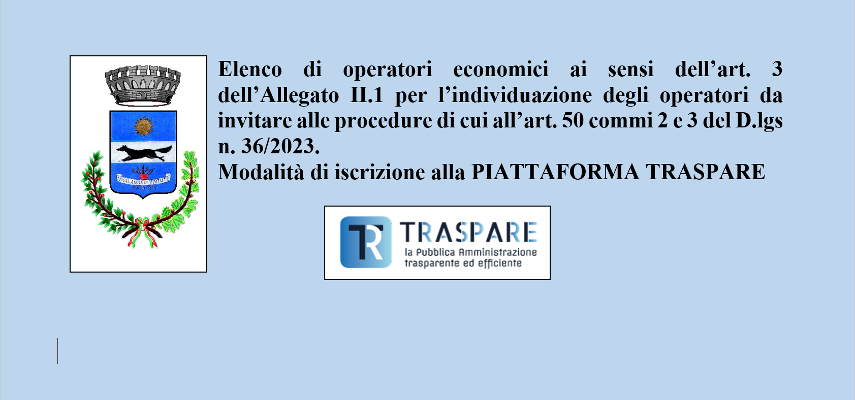 Informiamo gli operatori nel settore dei servizi di progettazione e gli operatori di tutti i settori inerenti i LAVORI/SERVIZI/FORNITURE che il comune di Volpiano ha attivato la piattaforma "TRASPARE" per la selezione di operatori, così come previsto dall'art. 50 commi 2 e 3 del D.Lgs. n. 36/2023"Codice dei Contratti".
