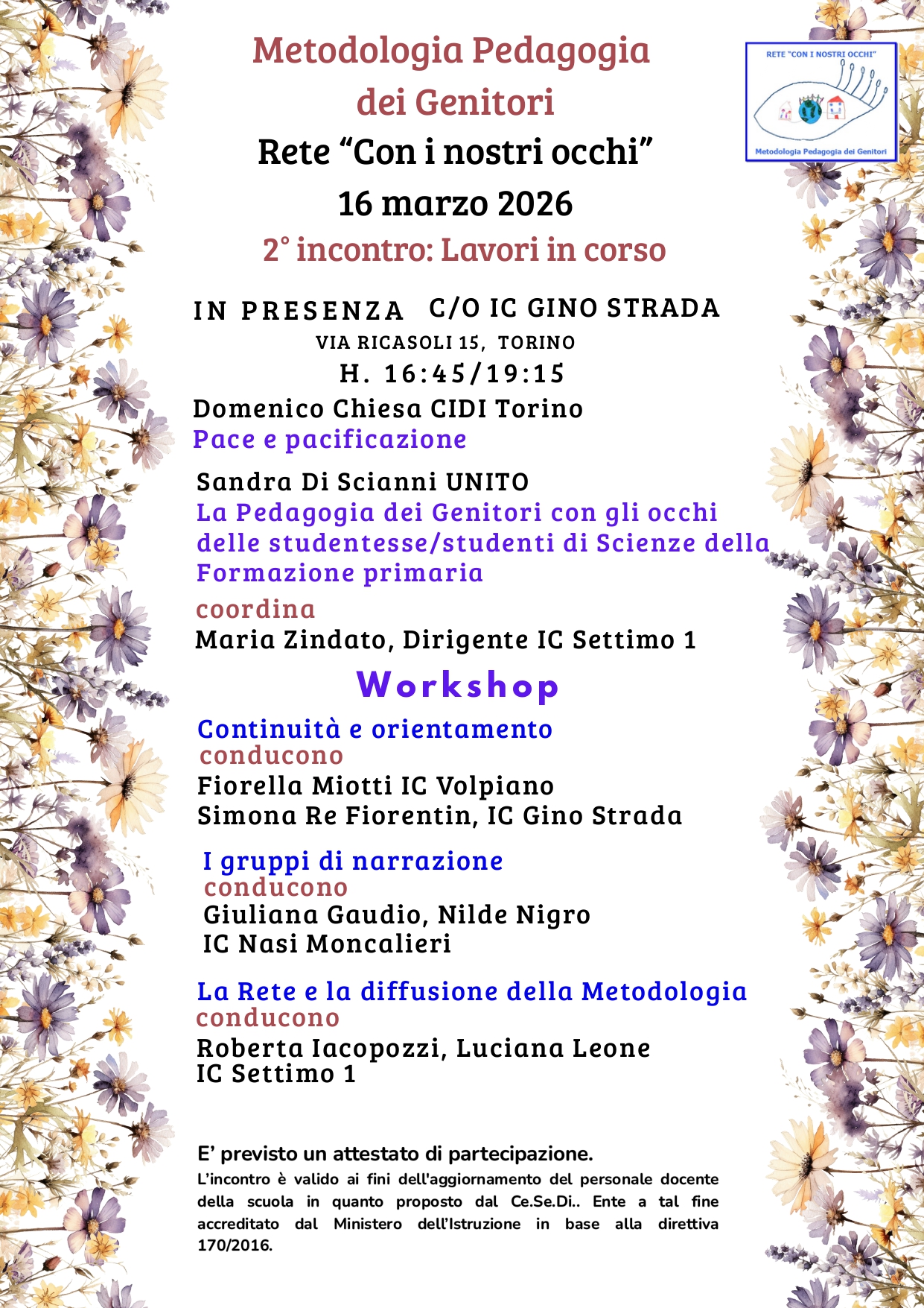 L’incontro è valido ai fini dell'aggiornamento del personale docente della scuola in quanto proposto dal Ce.Se.Di., Ente a tal fine accreditato dal Ministero dell’Istruzione in base alla direttiva 170/2016.