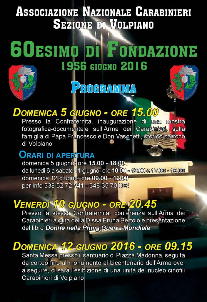 In occasione del 60° di Fondazione l'Associazione Nazionale Carabinieri - Sezione di Volpiano ha organizzato, il collaborazione con il gruppo "Amici del Passato", presso la Chiesa Confraternita una mostra fotografica-documentale sull'Arma dei Carabinieri, sulla famiglia di Papa Francesco e Don Vaschetti, storico parroco di Volpiano. La mostra è visitabile fino a sabato 11 giugno con il seguente orario: 10,00-12,00 e 17,00 - 19,00, mentre domenica 12 giugno rispetterà il seguente orario: 9,00 - 12,00.