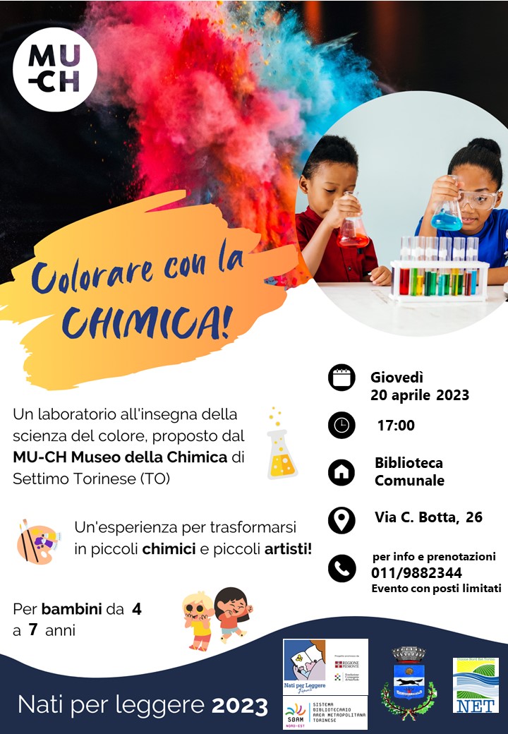 Nell’ambito del progetto «Nati per leggere 2023», alla biblioteca di Volpiano (via Carlo Botta, 26), giovedì 20 aprile alle 17, è in programma «Colorare con la chimica», un laboratorio per bambini da 4 a 7 anni proposto dal MU-CH (Museo della Chimica di Settimo Torinese), per trasformarsi in piccoli chimici e piccoli artisti. Posti limitati, info e prenotazioni al numero 011.9882344.
