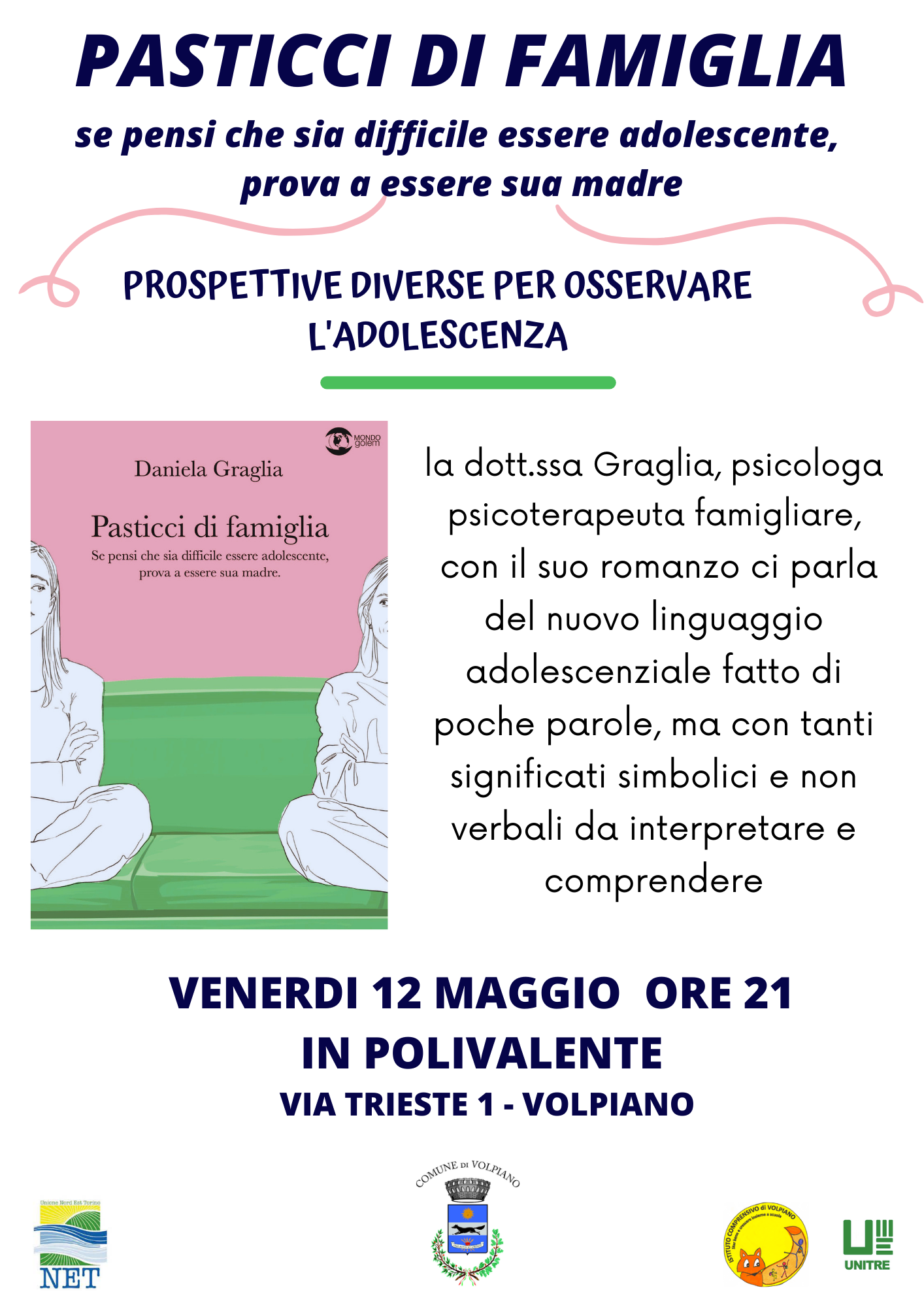 Venerdì 12 maggio alle 21, nella Sala Polivalente di Volpiano (via Trieste 1), Daniela Graglia, psicologa e psicoterapeuta sistemico-relazionale, partecipa ad un incontro sul linguaggio adolescenziale, prendendo spunto dal suo romanzo «Pasticci di famiglia. Se pensi che sia difficile essere adolescente, prova a essere sua madre» (Golem Edizioni); ingresso libero.