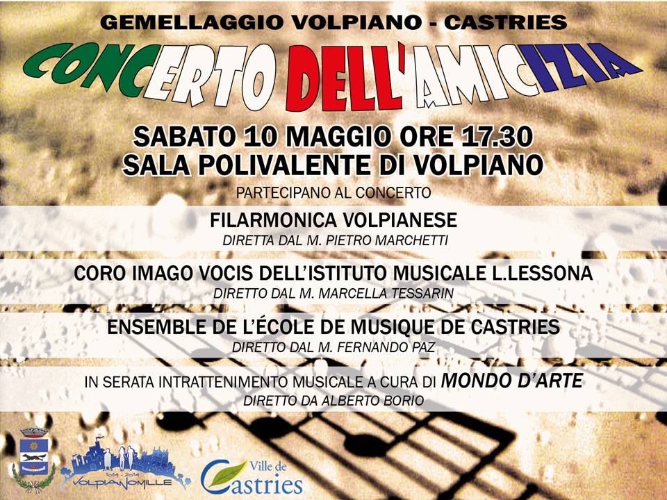 I paesi gemellati di Volpiano e Castries insieme con i loro gruppi musicali daranno vita il 10 maggio al “CONCERTO DELL’AMICIZIA”,eseguito da un centinaio di musicisti.