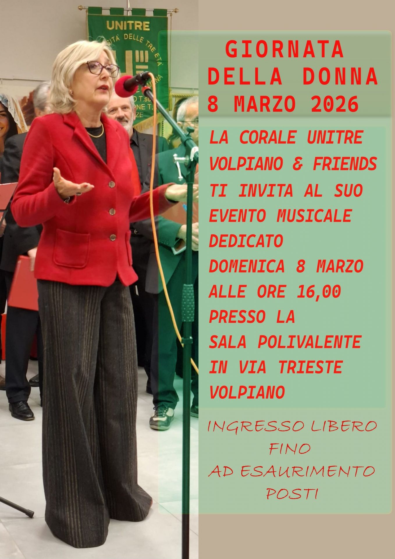 In occasione della Giornata Internazionale della Donna, domenica 8 marzo 2026 alle ore 16.00, la Corale Unitre Volpiano & Friends propone un evento musicale aperto alla cittadinanza presso la Sala Polivalente di via Trieste 1 a Volpiano.