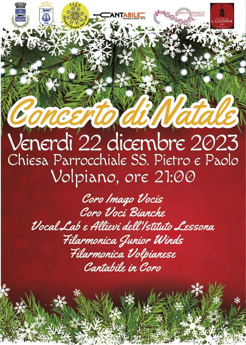 Nell'ambito delle manifestazioni natalizie siete inviatati a partecipare al Concerto di Natale che si terrà venerdì 22 dicembre 2023 alle ore 21 nella Chiesa Parrocchiale dei SS. Pietro e Paolo.