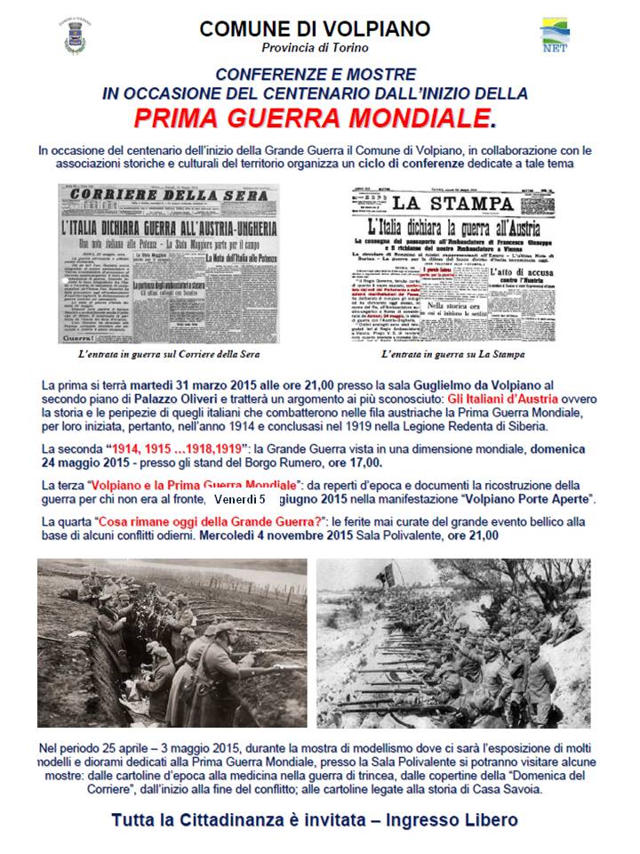 La terza conferenza in occasione di "Volpiano Porte Aperte" dal titolo "Volpianesi nella prima Guerra Mondiale" si terrà il 5 giugno 2015 nella Sala Guglielmo da Volpiano a Palazzo Oliveri.