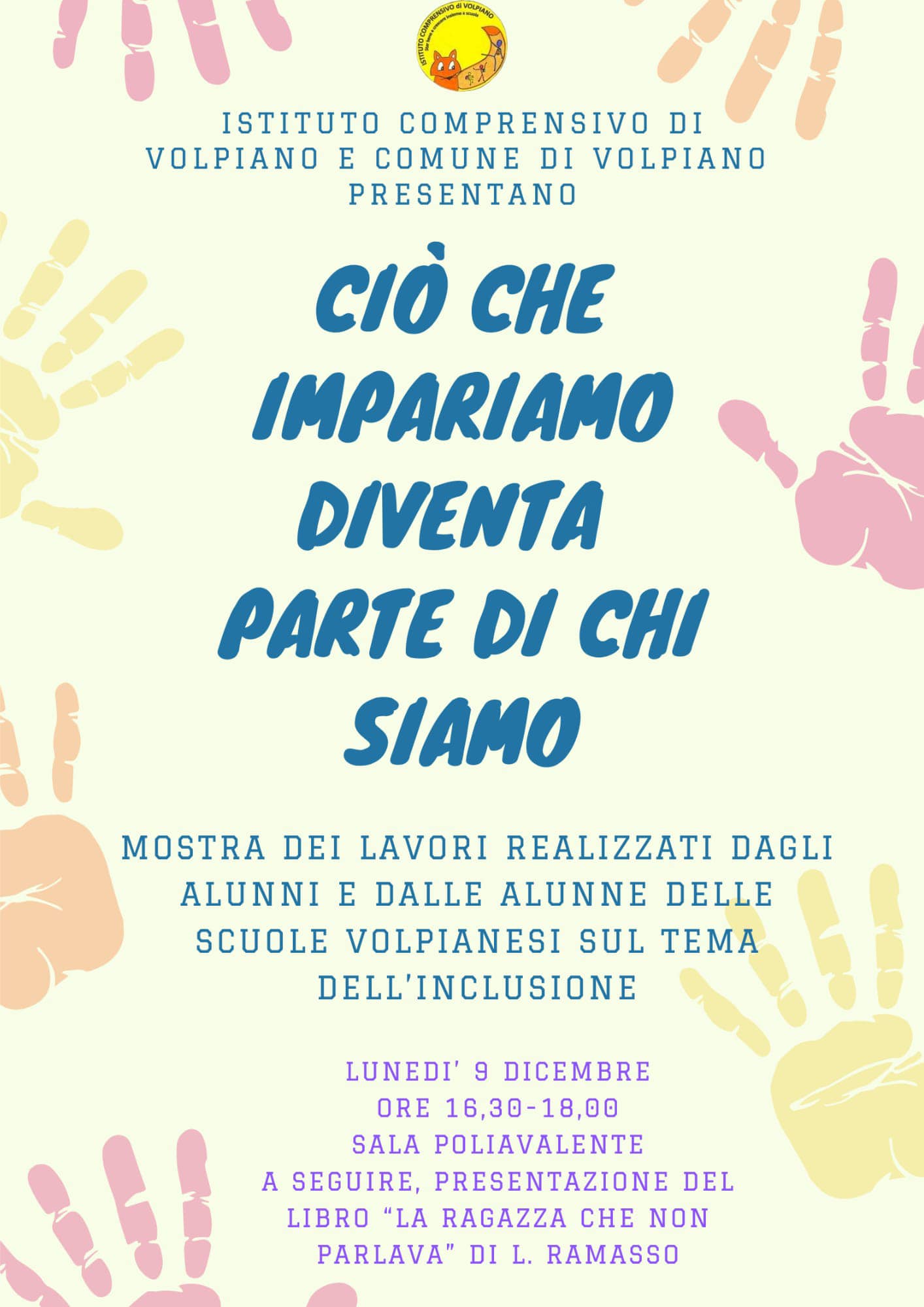 - ore 16:30 apertura della Mostra dei lavori realizzati dagli alunni e dalle alunne delle Scuole Volpianesi sul tema dell'inclusione;