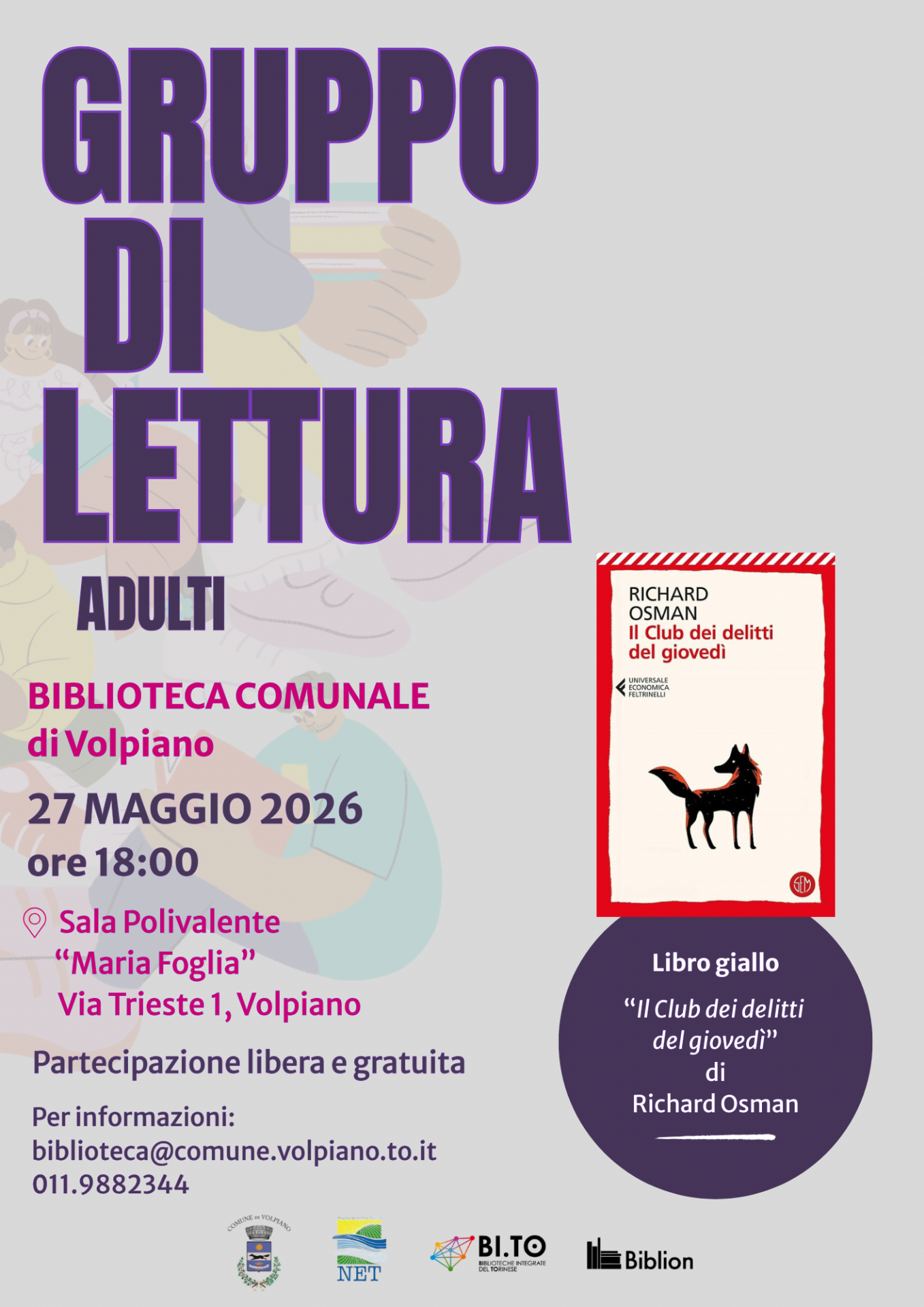 La Biblioteca Comunale di Volpiano invita tutti gli appassionati di lettura a partecipare al prossimo incontro del Gruppo di Lettura Adulti, in programma mercoledì 27 maggio 2026 alle ore 18:00 presso la Sala Polivalente “Maria Foglia” (Via Trieste 1, Volpiano).