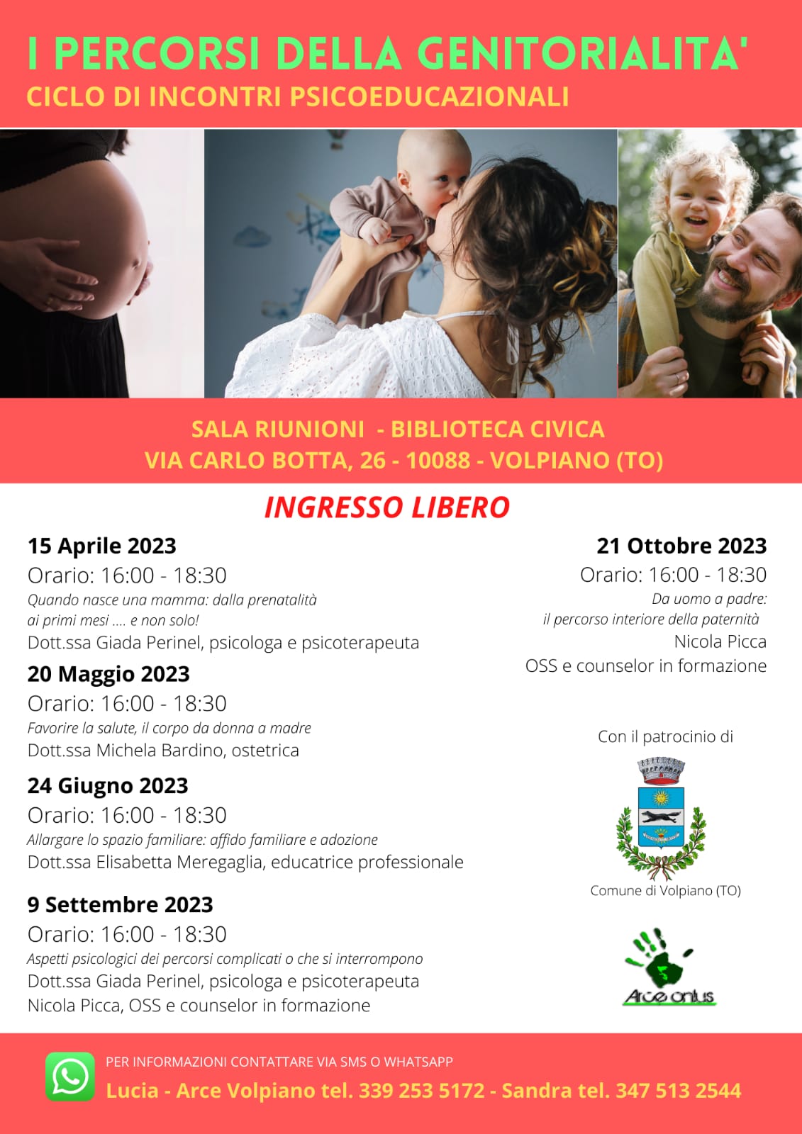L’associazione Arce Onlus organizza nella sala riunioni della biblioteca di Volpiano (via Carlo Botta, 26) un ciclo di incontri psicoeducazionali dal titolo «I percorsi della genitorialità», al sabato pomeriggio dalle 16 alle 18.30; ingresso libero, per informazioni contattare il numero 339.2535172.