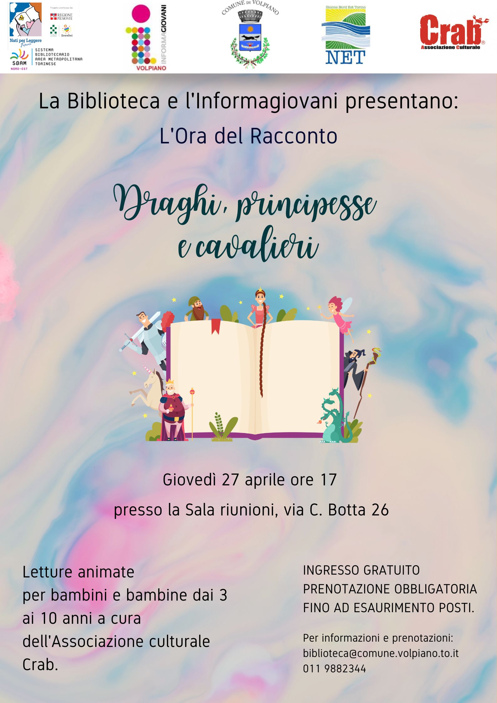 Giovedì 27 aprile alle 17 nella biblioteca comunale di Volpiano (via Carlo Botta, 26) si svolge «L’Ora del Racconto. Draghi, principesse e cavalieri», letture animate per bambine e bambini dai 3 ai 10 anni a cura dell’Associazione Culturale Crab; ingresso gratuito, posti limitati, prenotazione obbligatoria al numero 011.9882344, e-mail biblioteca@comune.volpiano.to.it.